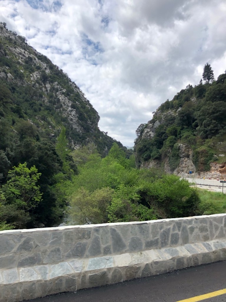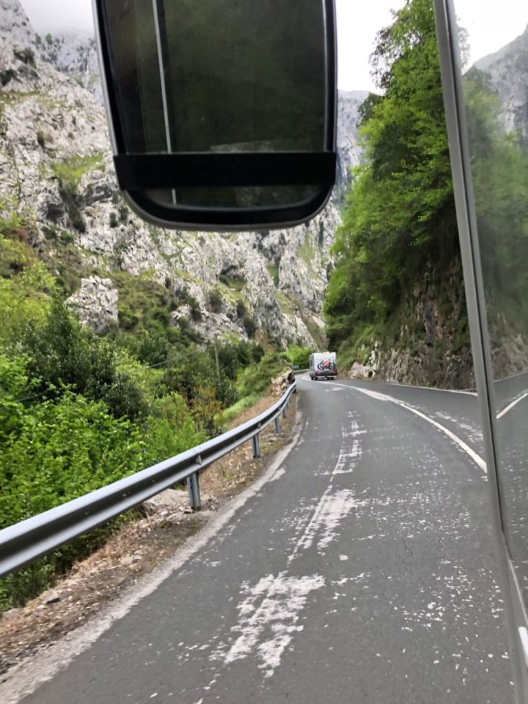 Our route to Riaño took us south through the Picos del Europe. The road, barely wide enough to take our vans, squeezed between steep cliffs in a landscape that could have come from a Tolkien novel. Despite the scenery it was only a gentle climb to the village of Potes, but then it became steadily steeper, the vans dropping down to 2ndgear on some of the hairpins, until we reached the top and began our descent into the region of Leon. I don’t know if Leon is a poorer region than Cantabria, but the road surface was immediately poorer, and it was a rough old ride into Portilla de la Reina where we stopped for lunch and to let our brakes and clutches cool down.