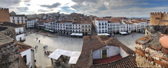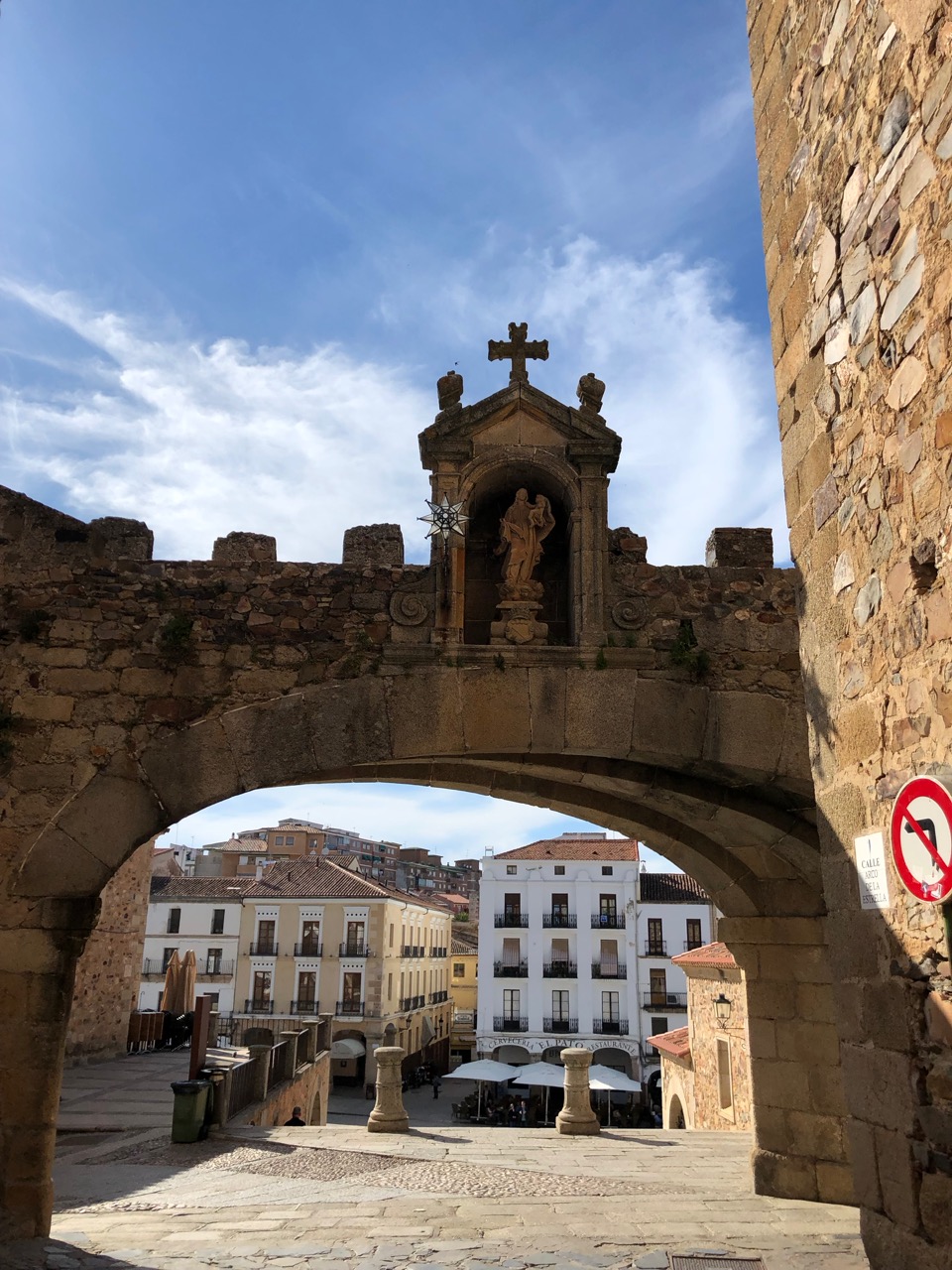 The temperature was well into the mid 20s but there was to be no peace for the wicked, so out came the bikes and trailers and we set off to explore the centre of Caceres. I confidently announced that I would lead, as I had sorted out some glitches with my bike’s Garmin. However halfway into our journey it had a hissy fit, shrugged its shoulders and gave up! my attempt at navigating on dead reckoning alone meant that we cycled an extra couple of kilometres including the ascent of a steep hill twice. We arrived at the town’s Plaza Mayor with the scent of mutiny in the air and talk of ditching the navigator.