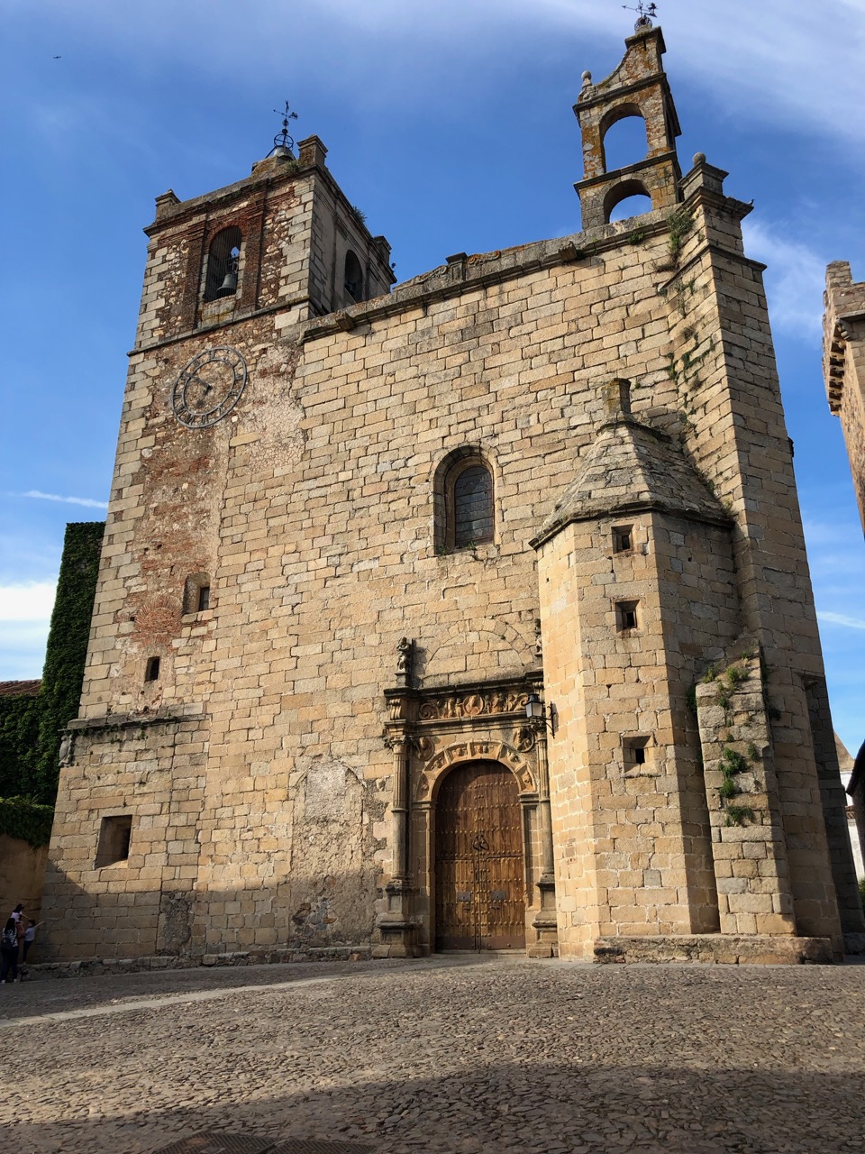 Caceres’ Plaza Mayor (town square) is supposed to be one of the best in Spain, but I didn’t think it matched up to the square in Salamanca. We shackled our bikes to the Tourist Information Office’s bin and skipped up the steps in to the Ciudad Monumental (apparently, they feature in Game of Thrones – a young person’s TV series apparently). We could hear some loud music playing and walked through a couple of squares to find a Flamenco School giving a dancing display. I am not usually a fan of dancing, but this Spanish take on line dancing was very impressive. A large group of women, girls and a solitary lad were clearly having a great time and their performance was being loudly appreciated by the watching crowd. Rio, was far more critical. He didn’t like the noise and preferred to watch from the safety of the church steps.
