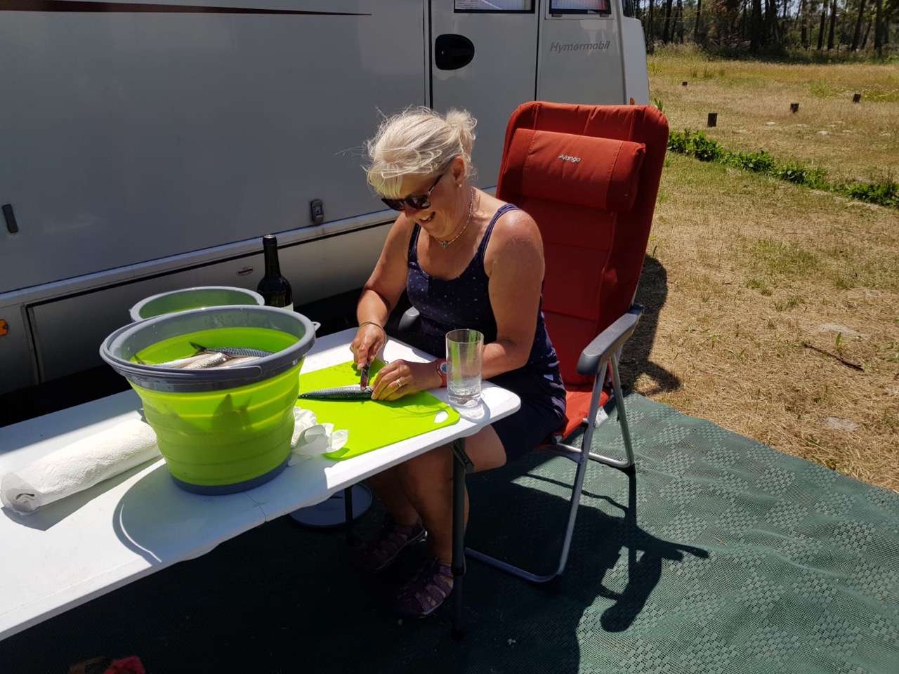 While we settled in for a drowsy afternoon of gentle blogging, listening to cricket and sun bathing in the lea of the vans, Wendy set up a fish-gutting operation, the like of which hasn’t been seen since the heydays of the fish wives of Great Yarmouth in the early 20thCentury.