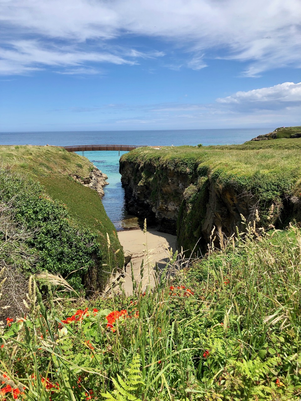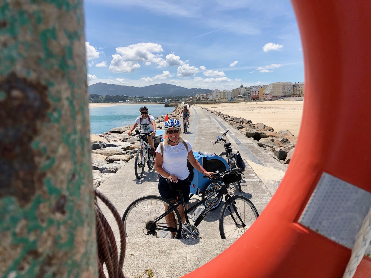 Not only are there Fozzes in Portugal there are also Fozzes in Spain too! Today we have found the small coastal town of Foz that sits just inside the Galician border with Asturia. We cycled into the town from the campsite which was a couple of kilometres or so to the west, along a great cycle path. Spain, like France, seems to have invested heavily in creating good tracks for cyclists and walkers. This was well paved, if a little rough for a dog carriage, and well signposted. The track followed yet another beautiful coastline of little beaches and rocky outcrops and down into the town.