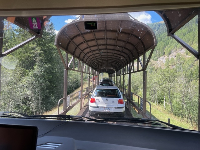 What is a ferry doing at the top of a mountain? It turned out to be a rail ferry that cut out miles and miles of tortuous hairpins by taking us through a tunnel underneath the Furkapass (for the last time Katy!) and the Rhone Glacier, the source of the Rhone. A very nice lady explained all this to us as she checked that our van was under 3.5metres tall and sold us our ticket as we assured her, we were only three metres tall now we have removed the satellite dome. We joined the small queue and watched as the train rolled in. The train consisted of twenty, open-sided, flat bed carriages with metal hoops holding up the roof. You drove on at one end and drove the length of the train.