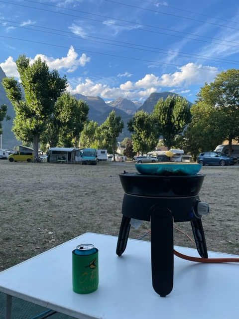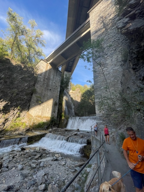Brig is a lovely town on the Rhone, in the shadow of the Jungfrau which in turn blocks our view of the Eiger. Our campsite is on the banks of one of the Rhone’s tributaries and we arrived just before the Fozzies and managed to get two pitches backing on to the river and under some shade as the temperature was well into the 30s. As you can imagine we hadn’t seen each other for fourteen days, so we had a lot of catching up to do!