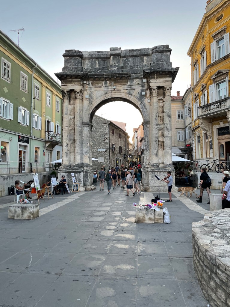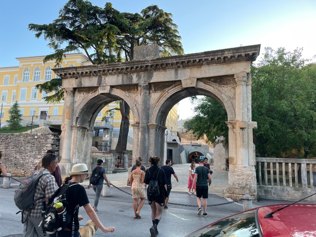 Sasha, our guide, met us at the sailor statue just below the amphitheatre. For the next two hours he took us around all the sights of the old town centre and through three millenniums’ worth of Pula and the Istrian Peninsular’s history. Including the amphitheatre, which was built in the first century AD (or CE if you are more modern than I am) and has the best preserved outer wall of all amphitheatre’s including the Coliseum, which was built at the same time; and finishing with the government’s closure of the ship building industry three years ago. (did you know that the word ‘arena’ comes from the latin word for the sand the romans used to absorb the blood and guts spilled in the amphitheatre, or our word ‘cravat’ comes from the neckwear worn by the Croatians in the Napoleonic wars – apparently old Boney rather fancied himself in one?) Sasha then recommended the best place for us to eat in town, and if you are ever in Pula we will recommend the Pizzeria Jupiter on Castropola ulica too! Not just pizzas, but great traditional Croatian food including locally caught fish, and the good local wine was only €5 a carafe!