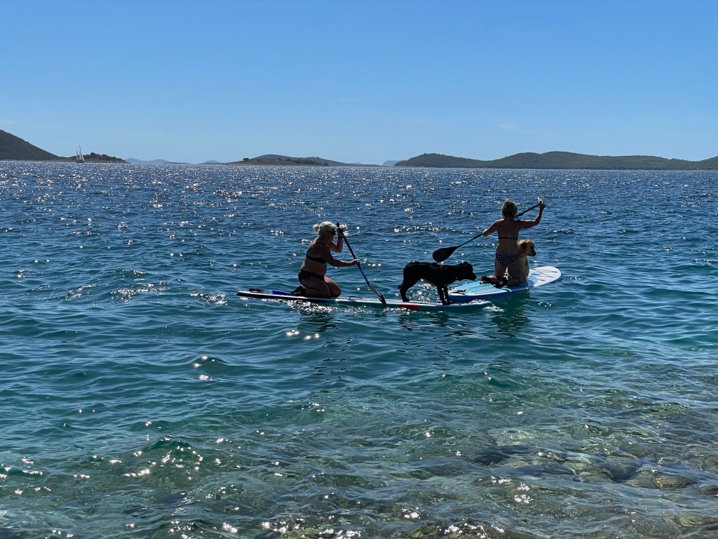 So that was the rest of the day sorted, a leisurely day of swimming, reading, sunbathing and paddle boarding (and blogging and listening to the cricket for some – well, me). Wendy even managed to coax Bryn on to a paddle board; and things were going very well until he spotted a sea gull bobbing nonchalantly on the water about 20 metres away. Despite Wendy’s best efforts, Bryn dived off the board and was off in quick pursuit. Enzo, sensing something was afoot, or at least afloat, dived off Lesley’s board as well, and together they ploughed through the water towards the gull, who realising he was outnumbered, quickly flew off. But the dogs didn’t stop. They kept on swimming towards where the gull had been. Suddenly we realised. It wasn’t the gull Bryn was after, it was the gull’s dinner! He plucked the fish from the water and turned towards the shore with this big fish hanging out of his mouth like a long silvery tongue, much to all the other sun bathers amusement. As he reached the shore, he finished the show by swallowing the fish, whole, in one gulp!