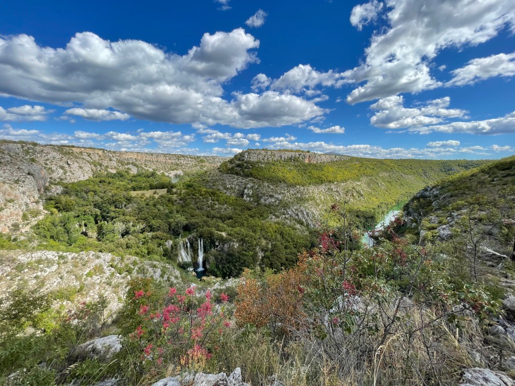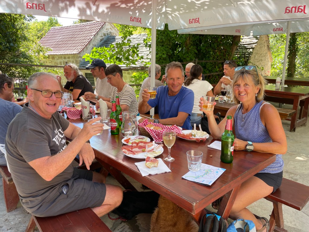 And so it was a drive deeper into the National Park. This is karst scenery, limestone country, where the plateau is pierced by deep gorges, carved by rivers old and new. We stopped a couple of times to see the Kljucica gorge near to where a German film company had filmed a ‘western’, trying to cash in on the ‘spaghetti western’ boom of the 60s and 70s; then the Visovac monastery on an island in the middle of lake Visovac. Before arriving at Roski Slap for lunch. We had been promised a ‘picnic lunch’, but after a long morning, this felt like a banquet. Baskets of bread, were accompanied by plates of salads, cheeses and hams and beer and wine. It was like a Redwall party (that’s for Tom Foz if he is watching?) More bread was delivered and then came the brandy! “Would you like cherry, plum or walnut brandy?” It would be rude not to try all three; so what was the winner?
