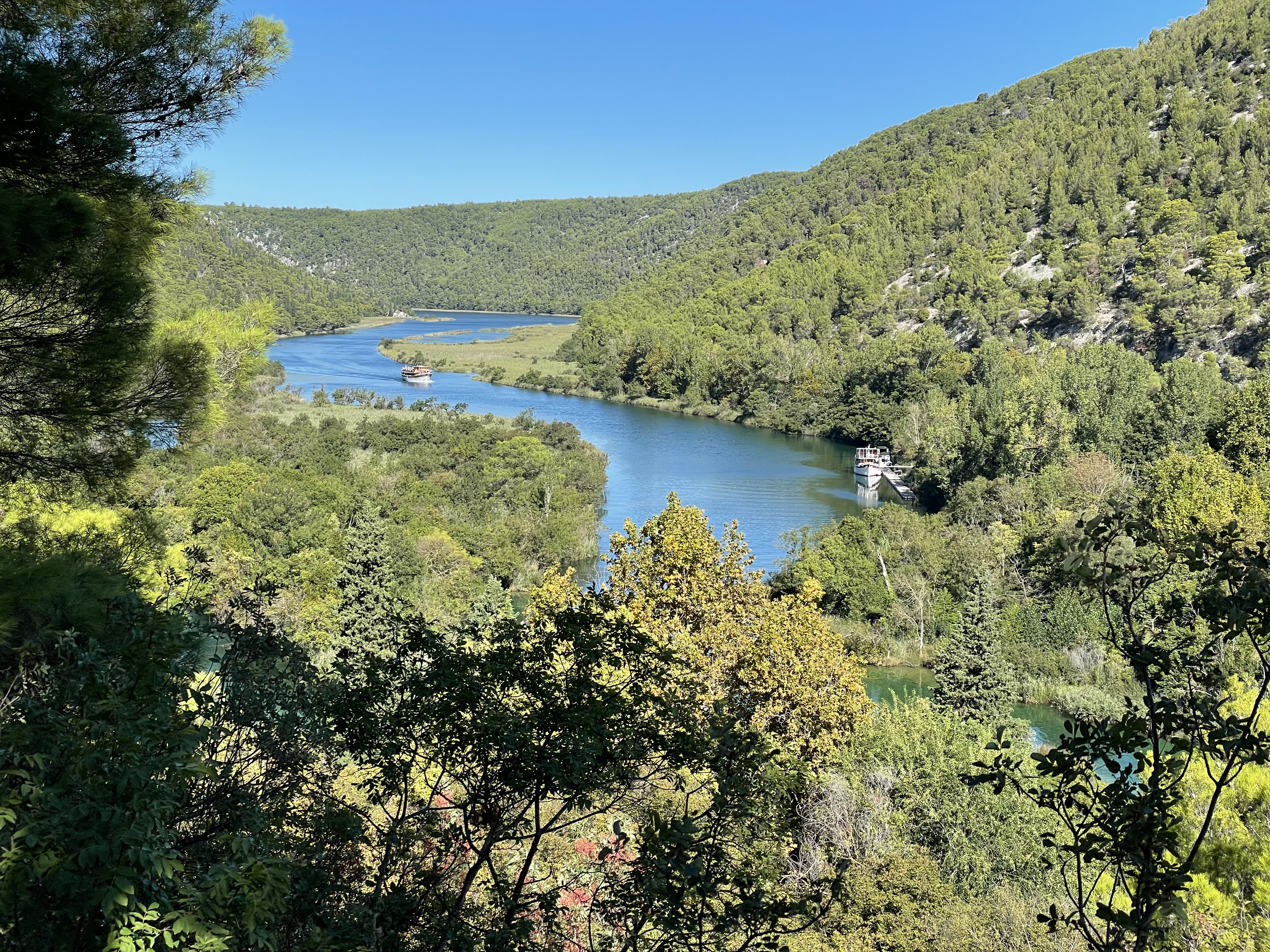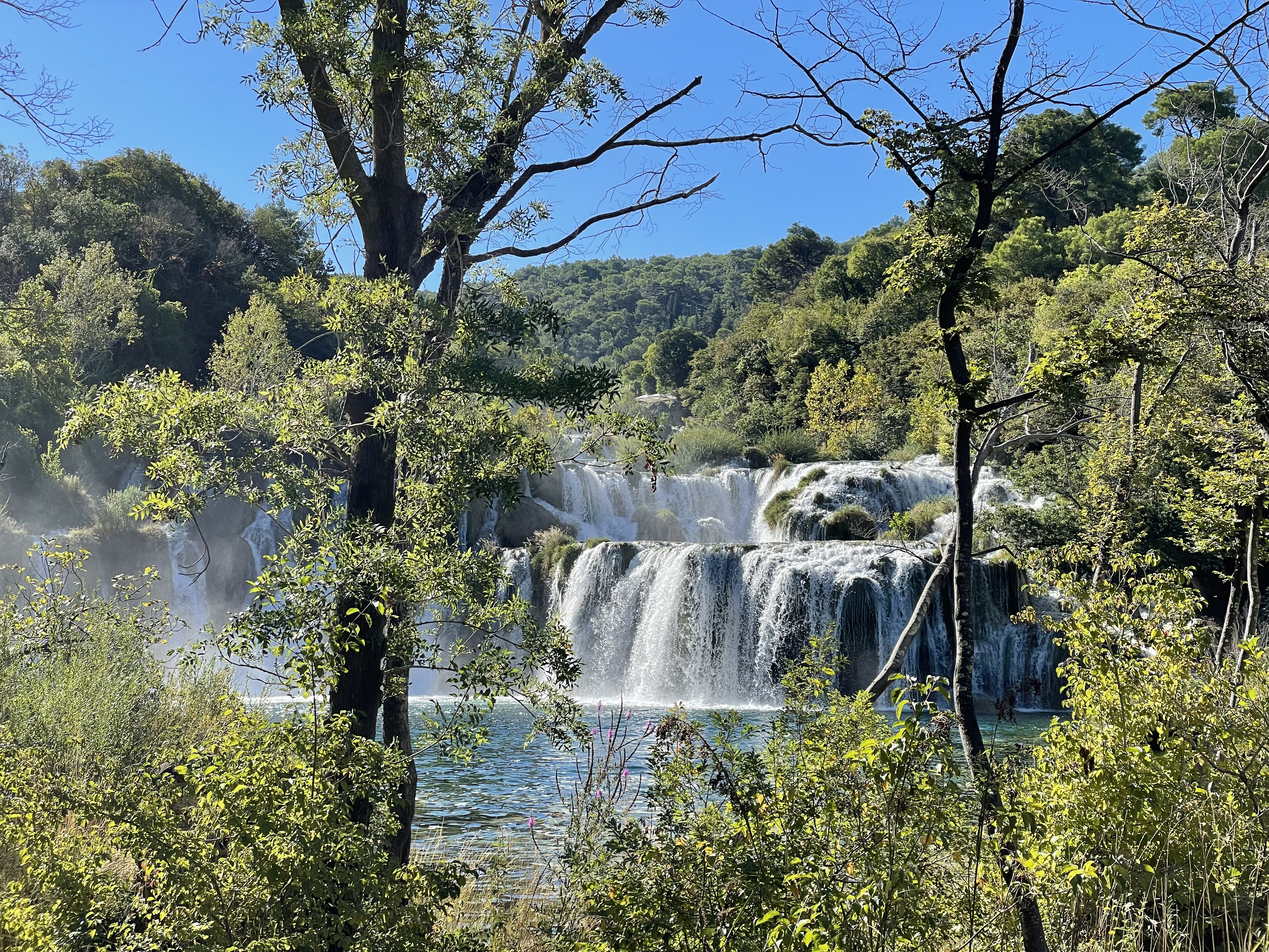 Twenty minutes late, our guide appeared with Mr Campsite Owner, in two different minibuses. While we were enjoying the delights of the Krka waterways, our original bus had developed problems with its automatic gearbox and so between them an emergency plan was in place. We used the opportunity to jump into Mr CO’s smaller minibus with a jolly Dutch couple and so avoid a particularly annoying, barking, bearded collie belong to some Germans.