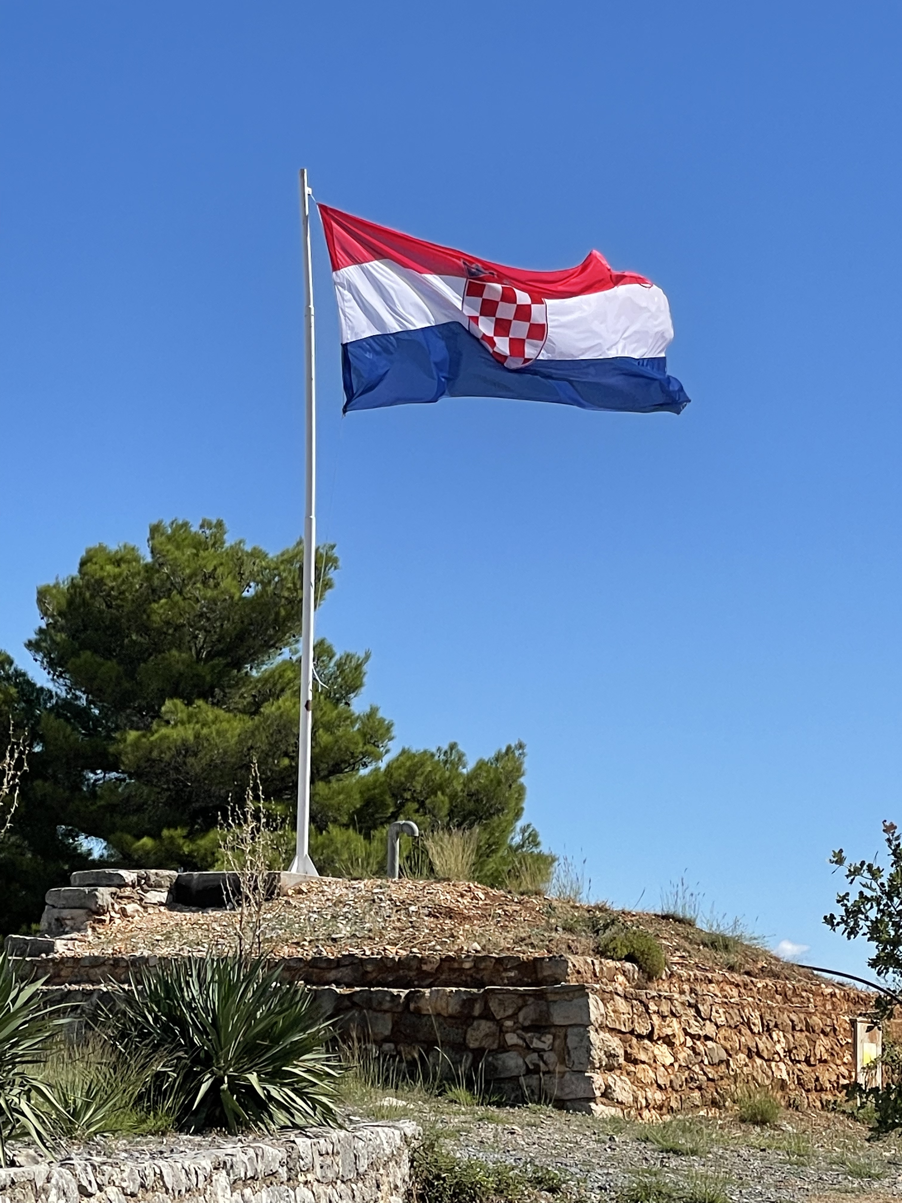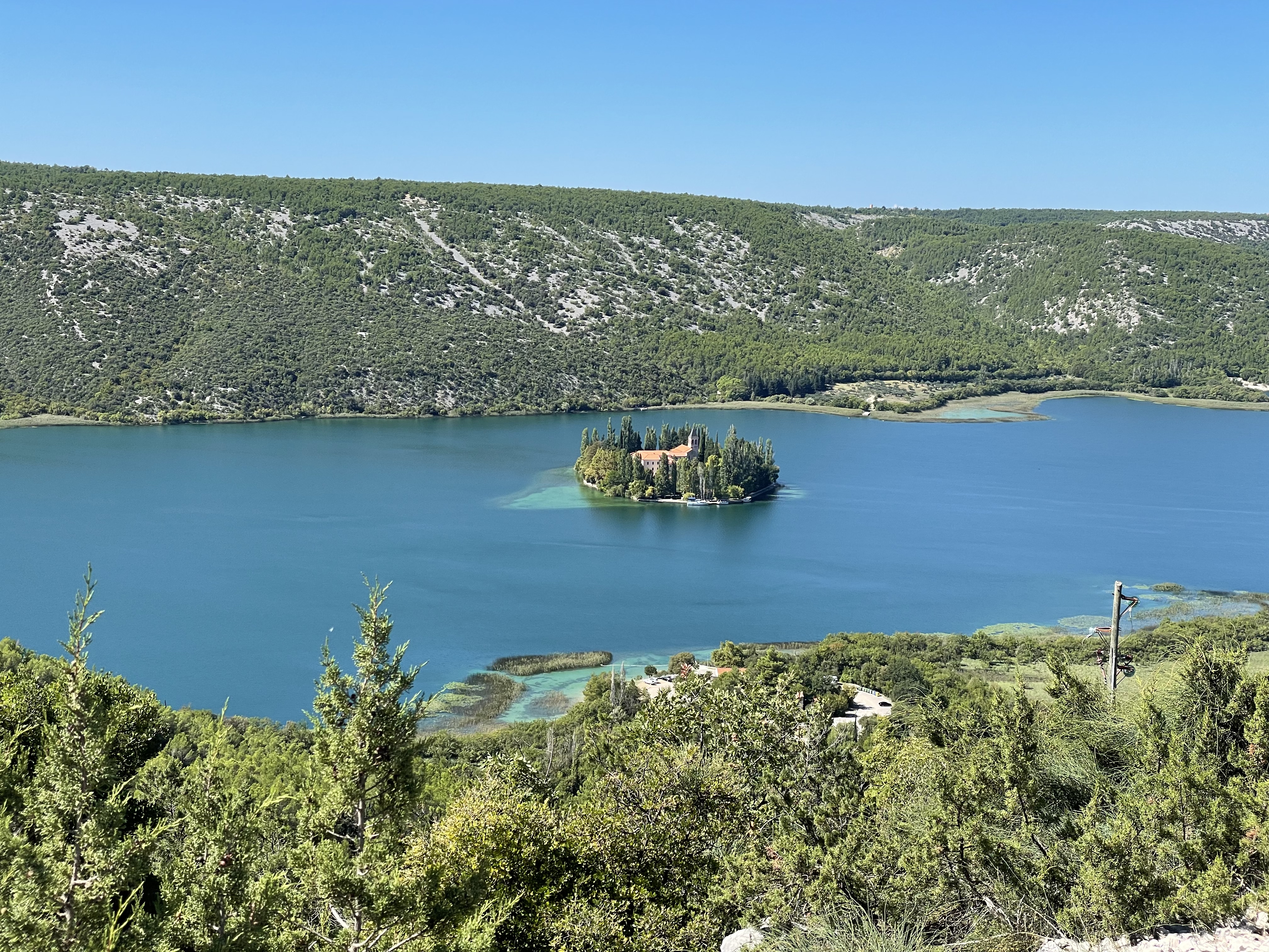 Off we rattled at a breakneck speed to our first stop, the lakes and waterfalls. These again are a chain of travertine (tufa) lakes and cascades, similar to those we saw at Plitvice. This time it took us only 90 minutes to see them all as there are fewer of them. The crowning glory was Skradinski Buk waterfall, which is over 800m long. However it was struggling to look impressive in the current drought. It was also the site of almost the first hydroelectric scheme in the world, losing out by two days to Tesla’s Niagara Falls scheme by two days in 1895. But it did mean that Sibenik was one of the first towns in the world to have electric street lights. The first electric turbines were based on the horizontal cup technology that we had seen in Koruna, powering the flour and sawmills.