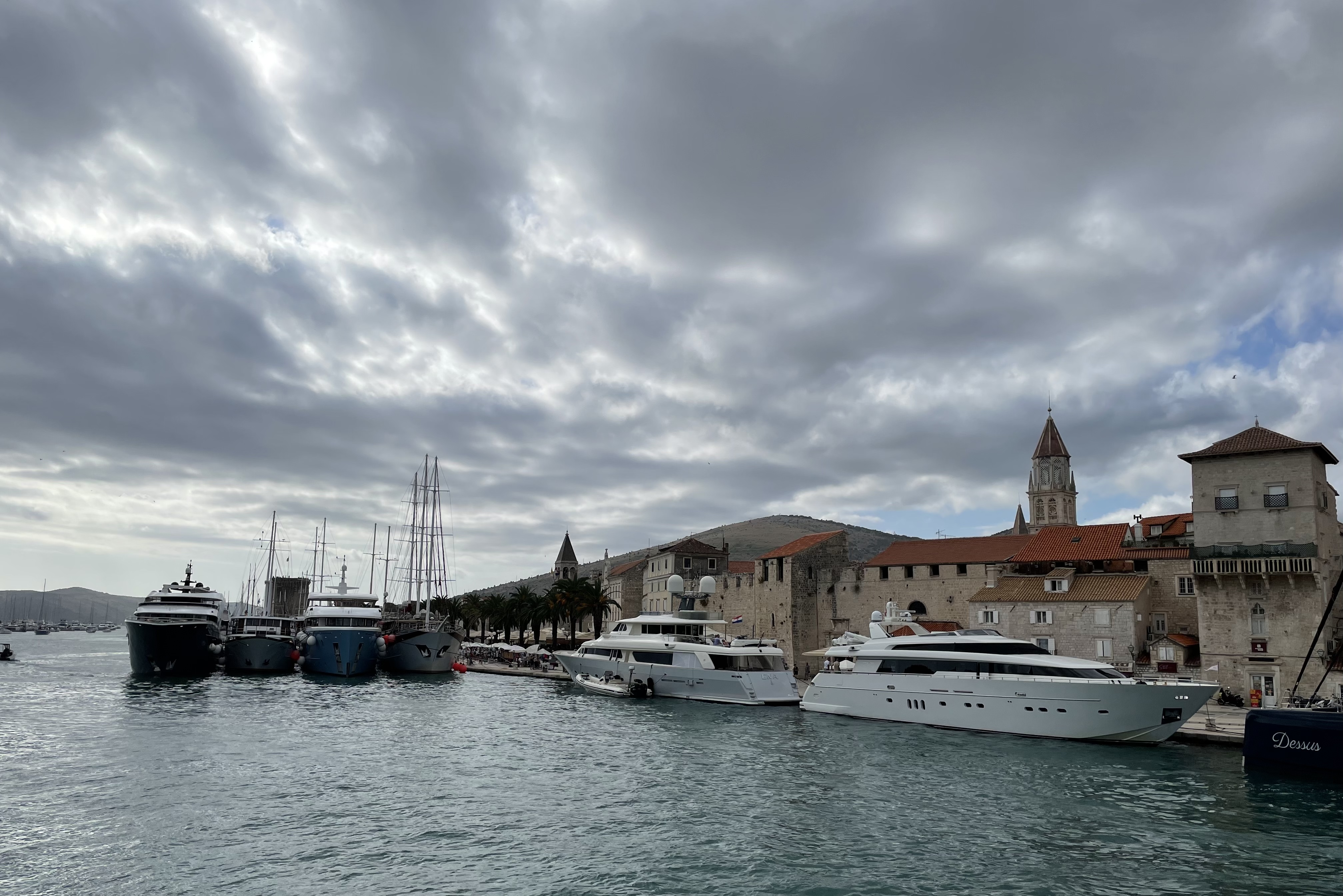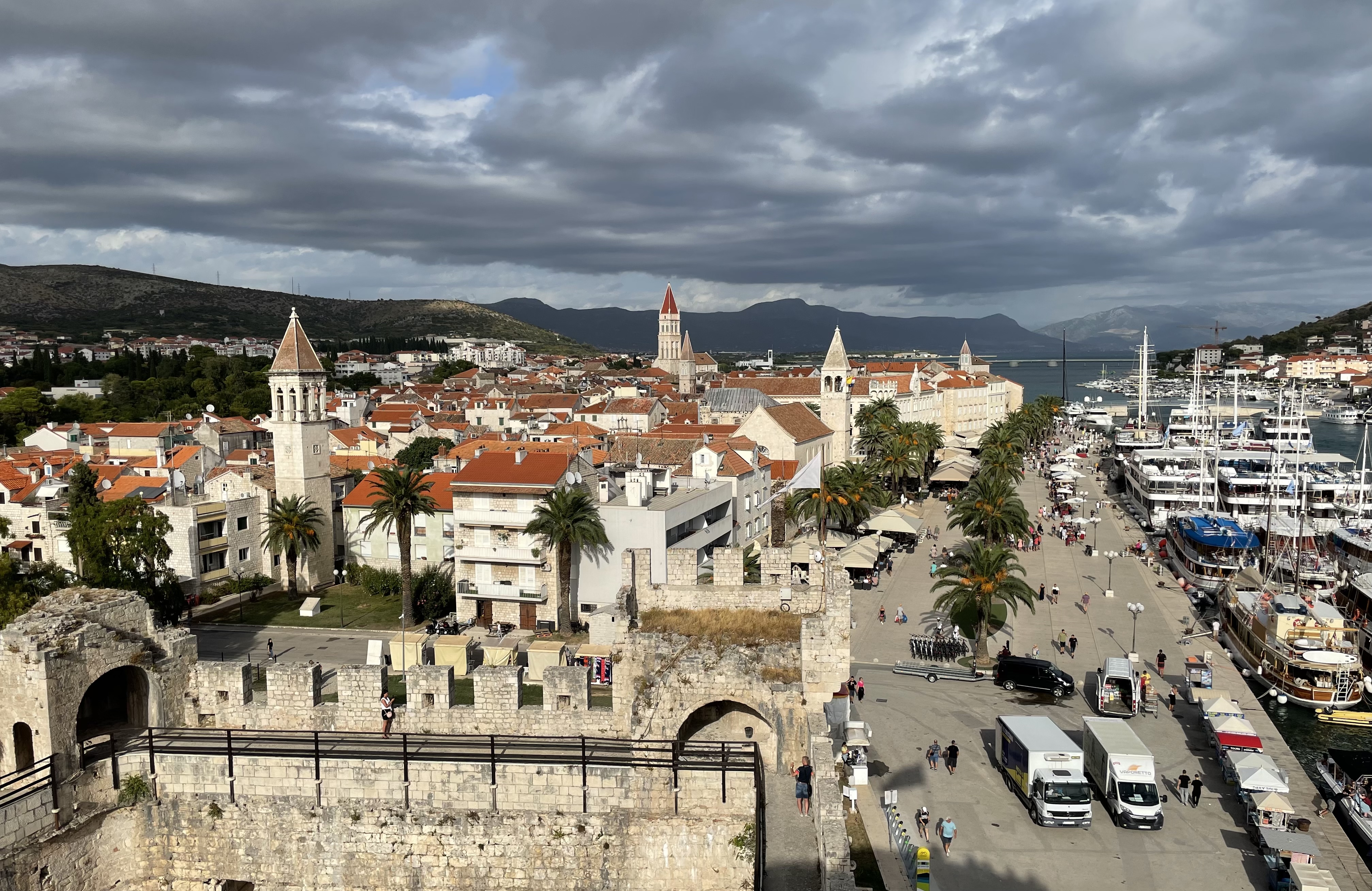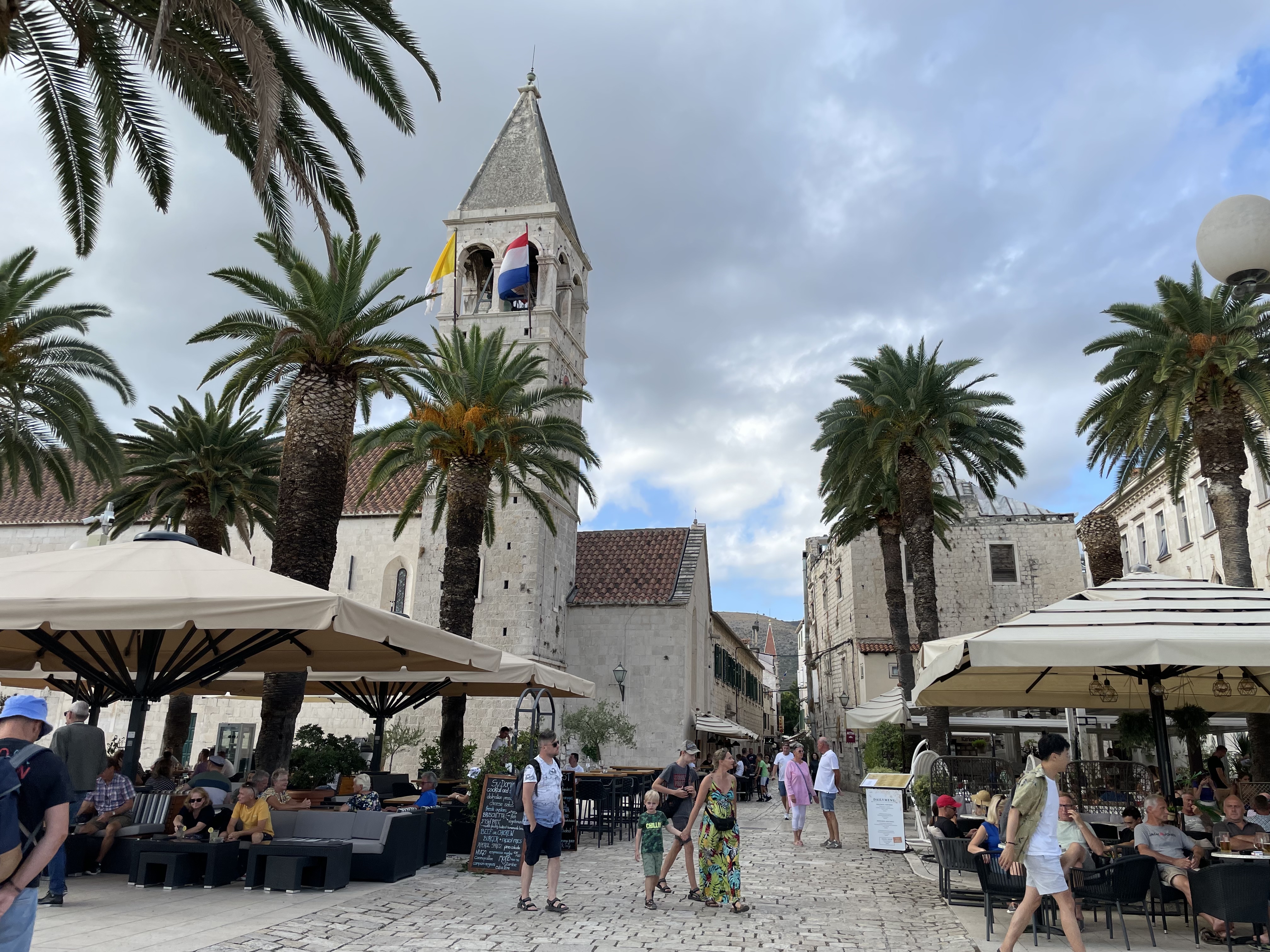 I left you, dear reader, in Dubrovnik, at the end of yet another memorable day in Croatia. The next day, Friday, we drove under darkening skies, north up the coast road towards Trogir. Soon we hit the tail end of the storm that had hit Ancona and it was coming down like ‘stair rods’ (Back in the olden days, before the invention of carpet grippers, stair carpets were held in place by metal rods attached to the back of the tread). There were plenty of tunnels on the route which was a ‘good thing’ as visibility was better in the tunnel and it gave the wipers chance to cope with the backlog of water. As we pulled in for a coffee and a croissant it looked as if the charm had worn off my new waterproof – but no! As I pulled the hand brake on the rain stopped, so the luck waterproof stayed on the hook. At this rate I will be able to take it back to Go Outdoors and get a refund!