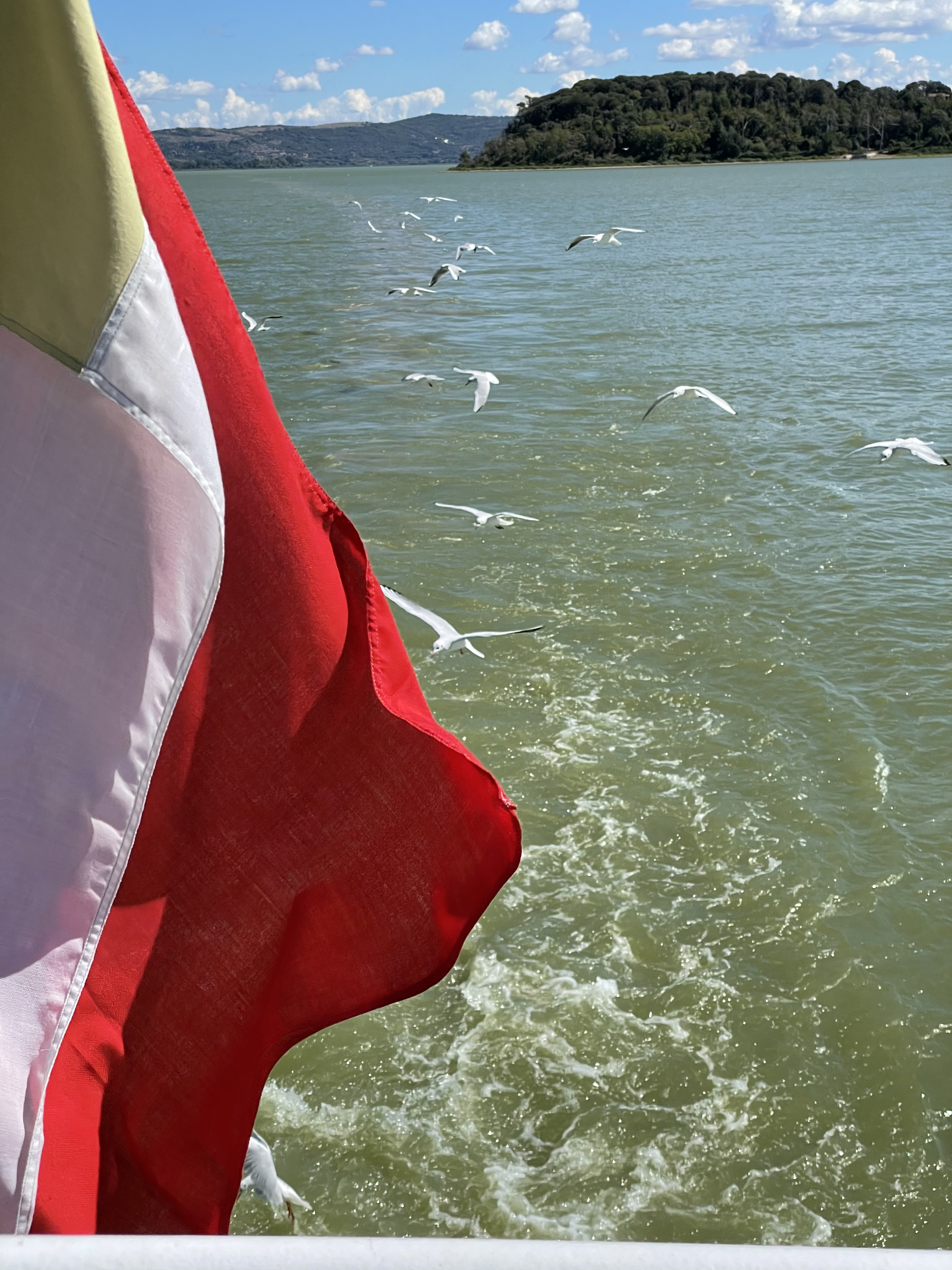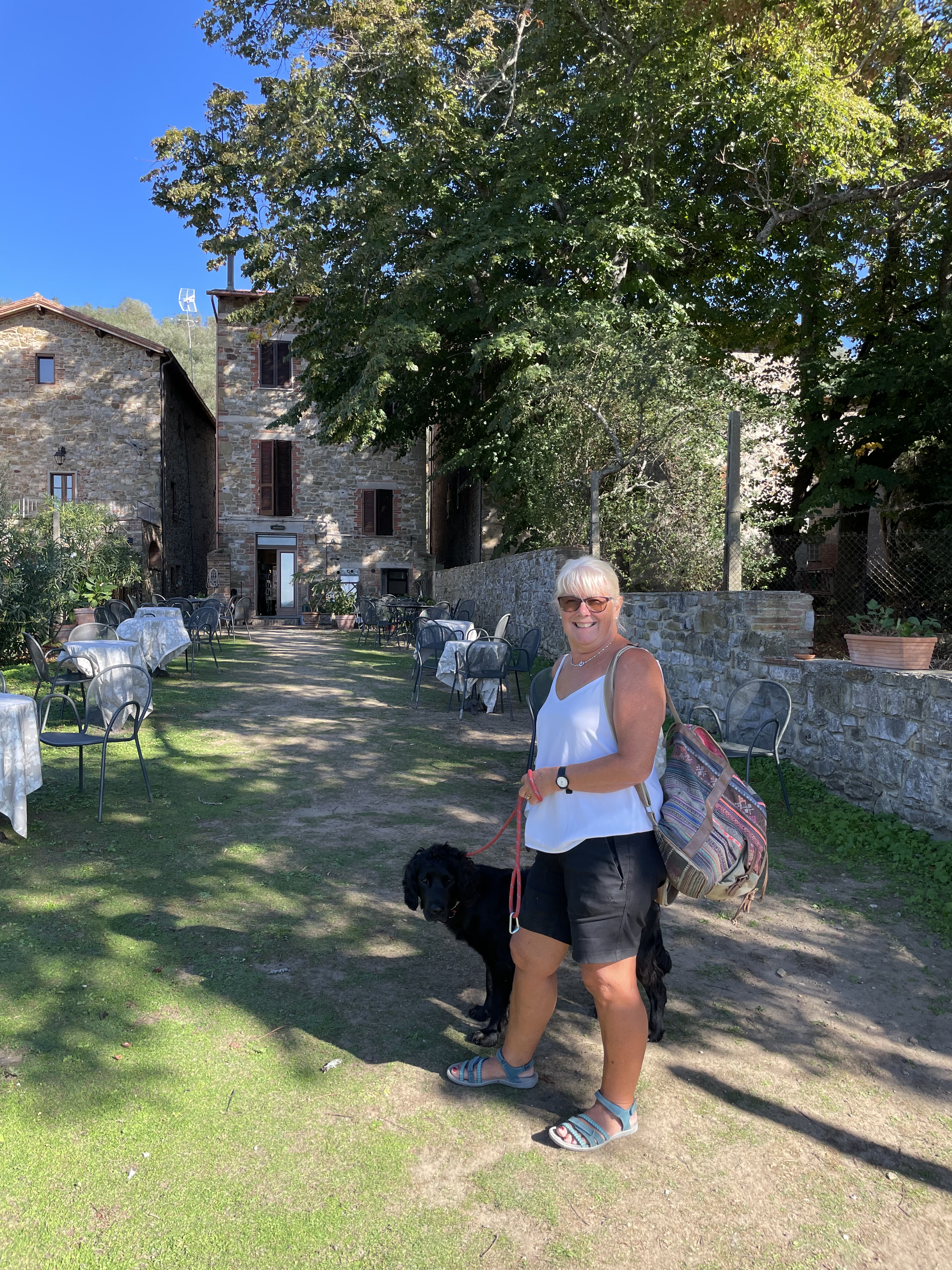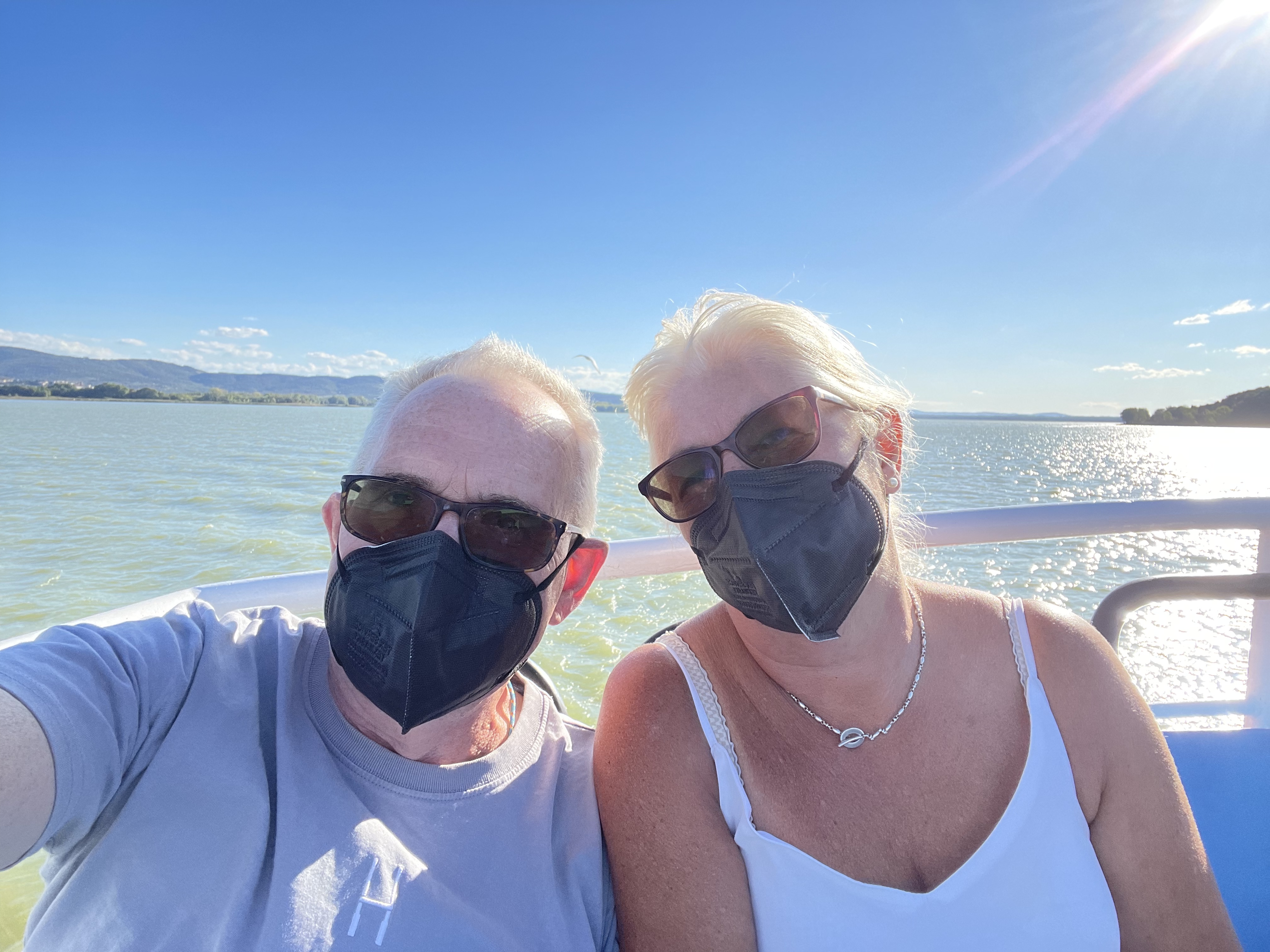 With bike riding firmly off the agenda for Bryn, on Tuesday we waved adieu to the Fozzies, as they set off on a marathon expedition to Castiglione and back. A distance of 50km or so. The Jones’ party set off back to Passignano to catch the ferry. We had a last minute panic in our attempt to catch the boat. We weren’t allowed on with our standard UK face masks we had to have better ones, so Wendy had to run the length of the pier and back to get to a souvenir shop that sold the regulation face covering. Bryn had to wear a muzzle too and wasn’t happy and found various ways to dislodge it, but as he was lying on the deck under our seats no one could tell.