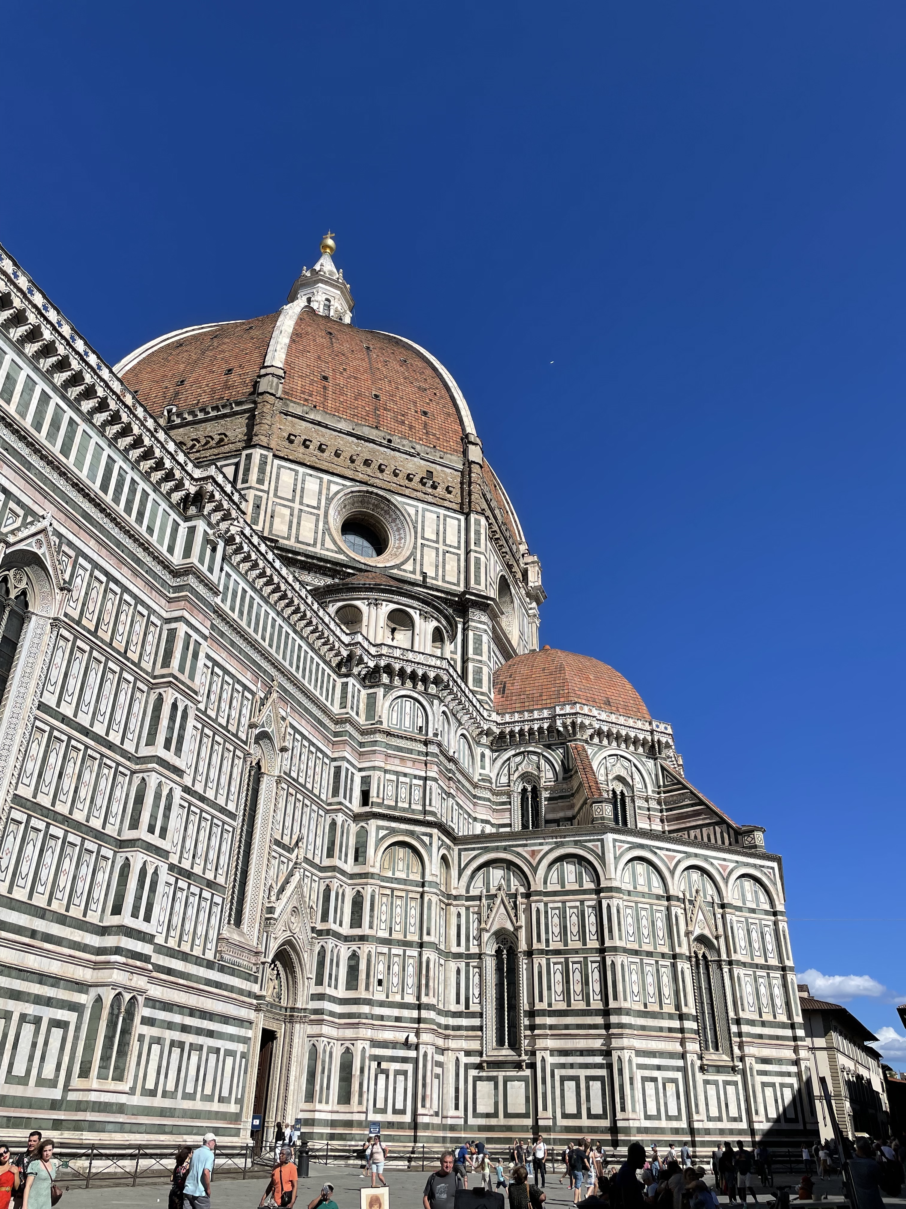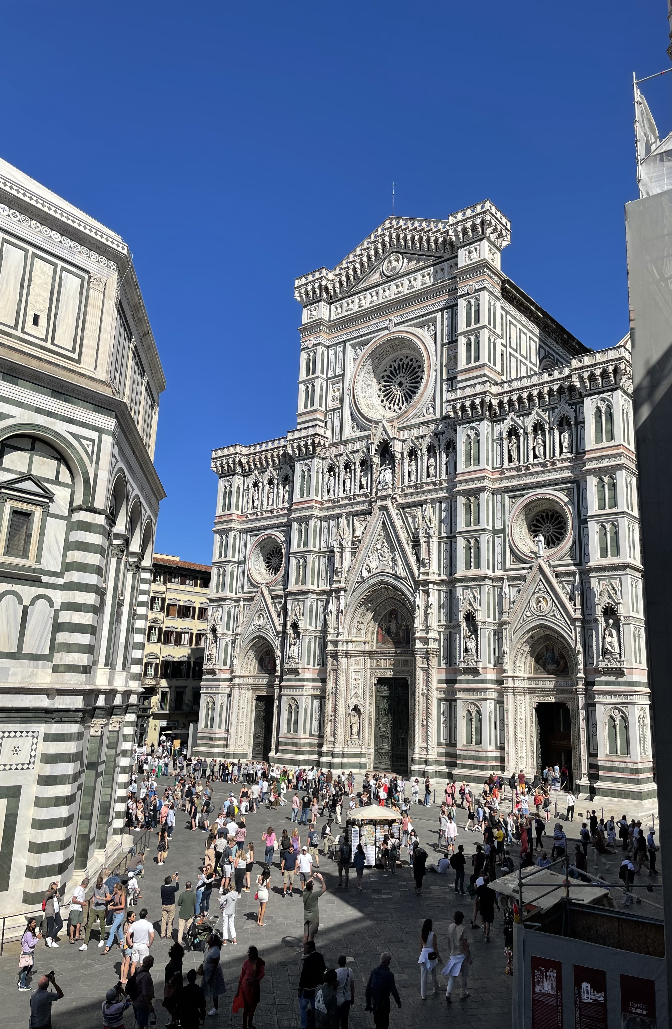 We made an early morning dash on Wednesday, from Lago Trasimeno to ‘Camping hu Firenze’ on the banks of the Arno, less than 5km from the centre of the city. The camp site is pretty new and very good. It has a shuttle bus service to the city and what a city it is! The shuttle bus dropped us off ten minutes walk along the river from the Ponte Vecchio, the old bridge lined with jewellery shops, and as we walked we kept getting more and more glimpses of its magnificence. We walked from the Ponte Vecchio up to the Cathedral di Santa Maria, one of the most stunning buildings I have seen that appeared to glow and shimmer as the marble reflected the sunshine. We had a coffee in the cathedral square at a café/bar called ‘New Move’ which was also a specialist vinyl record shop full of photos of famous bands from the 60s to the noughties. It has a first floor balcony that provides the best vantage point for photos of the Cathedral and the Baptistery.