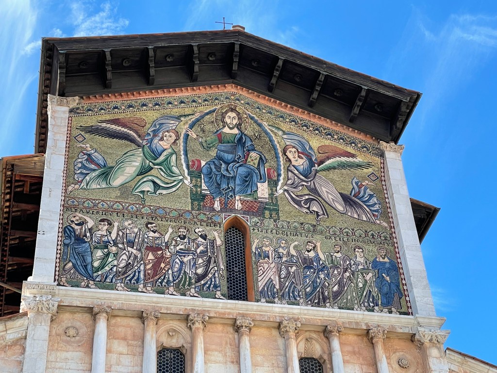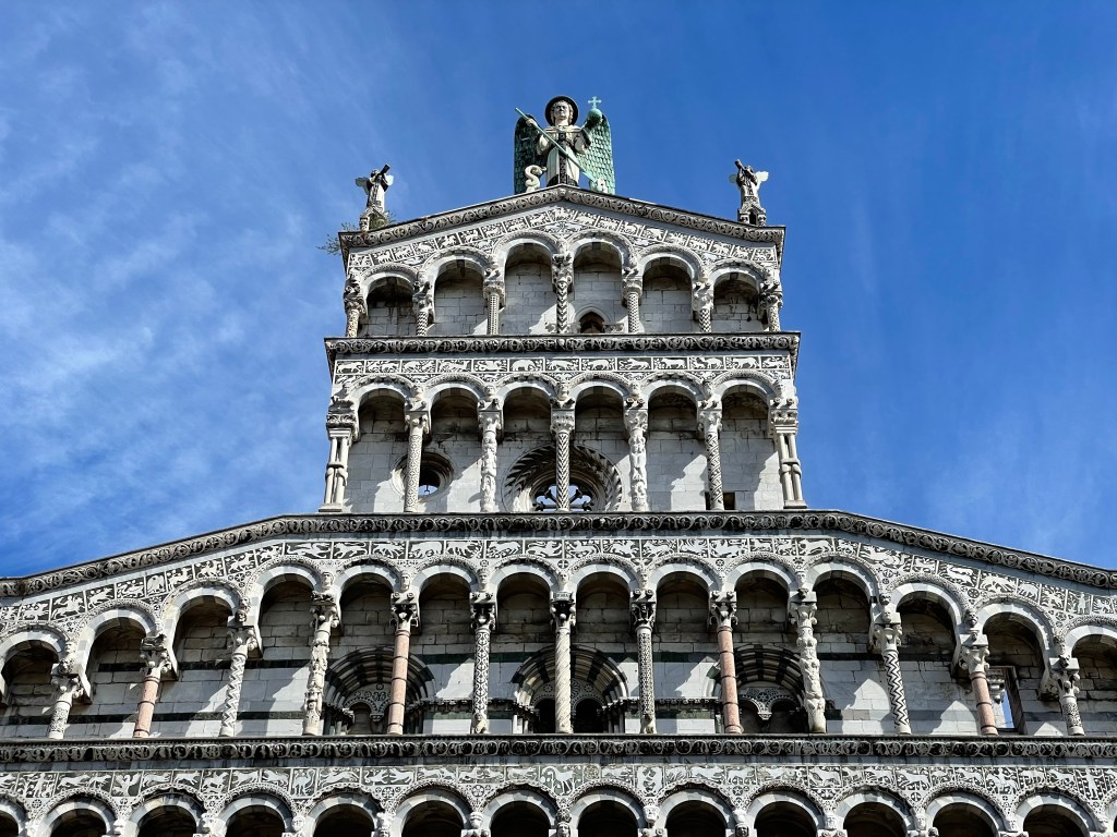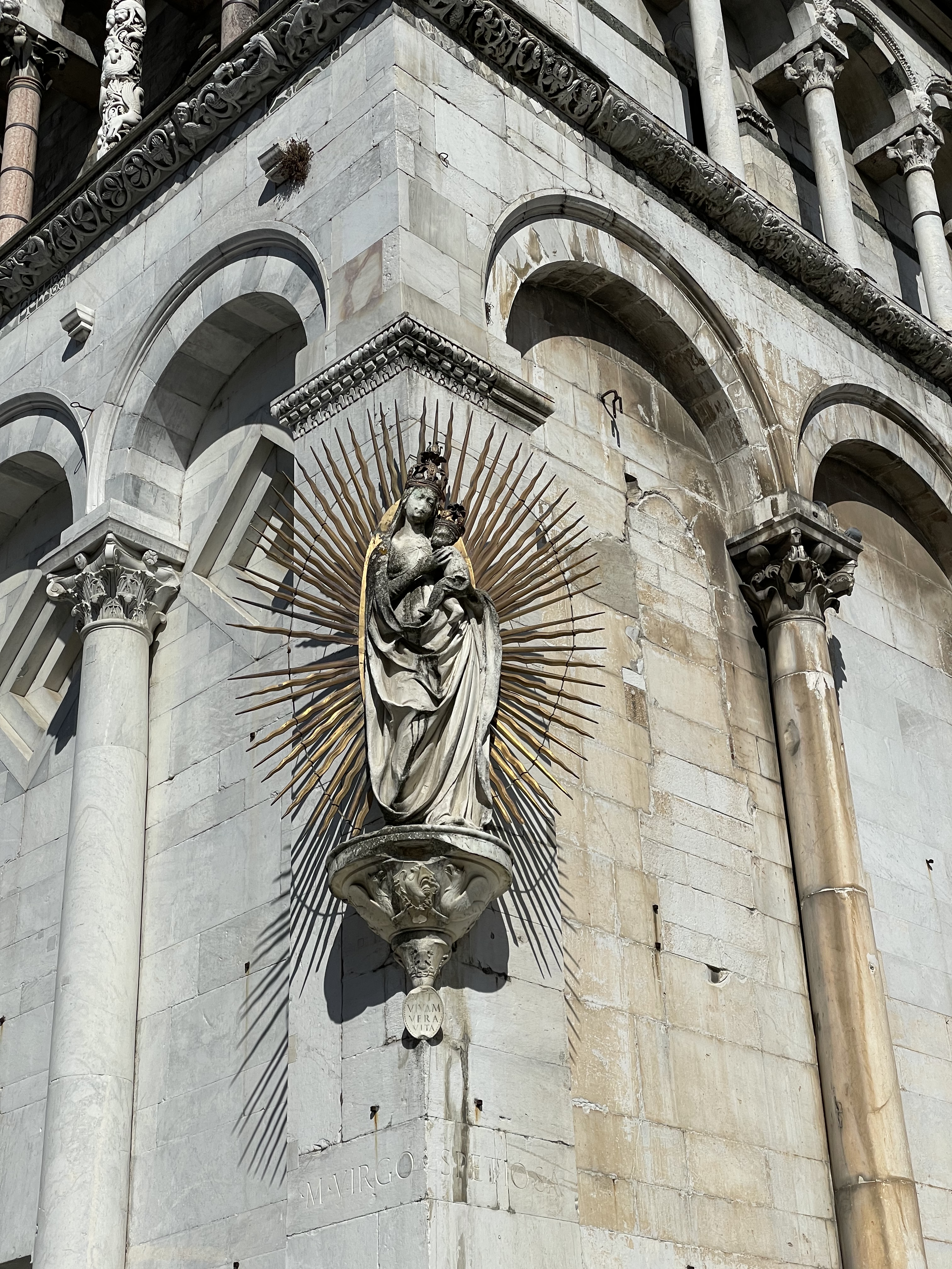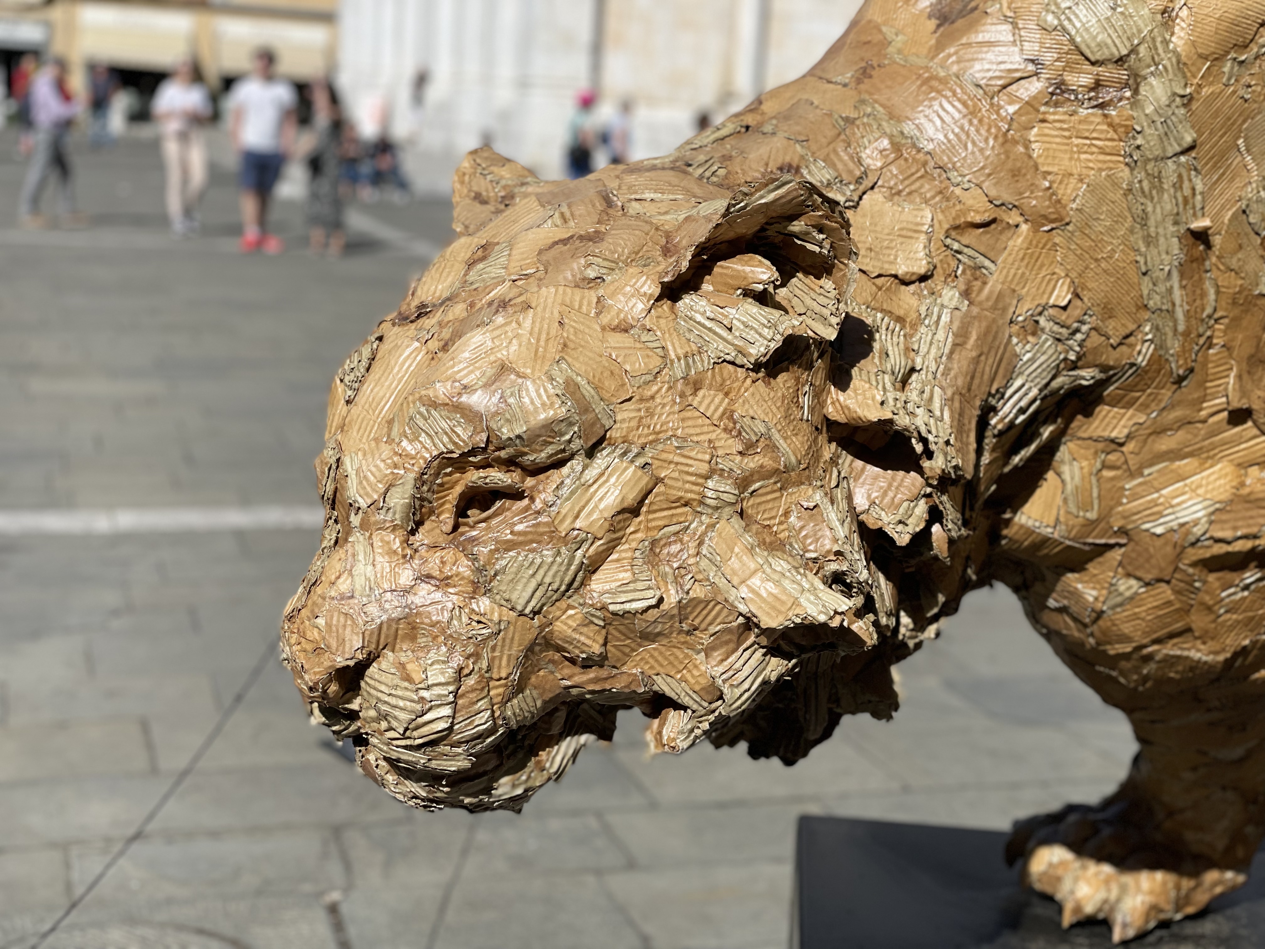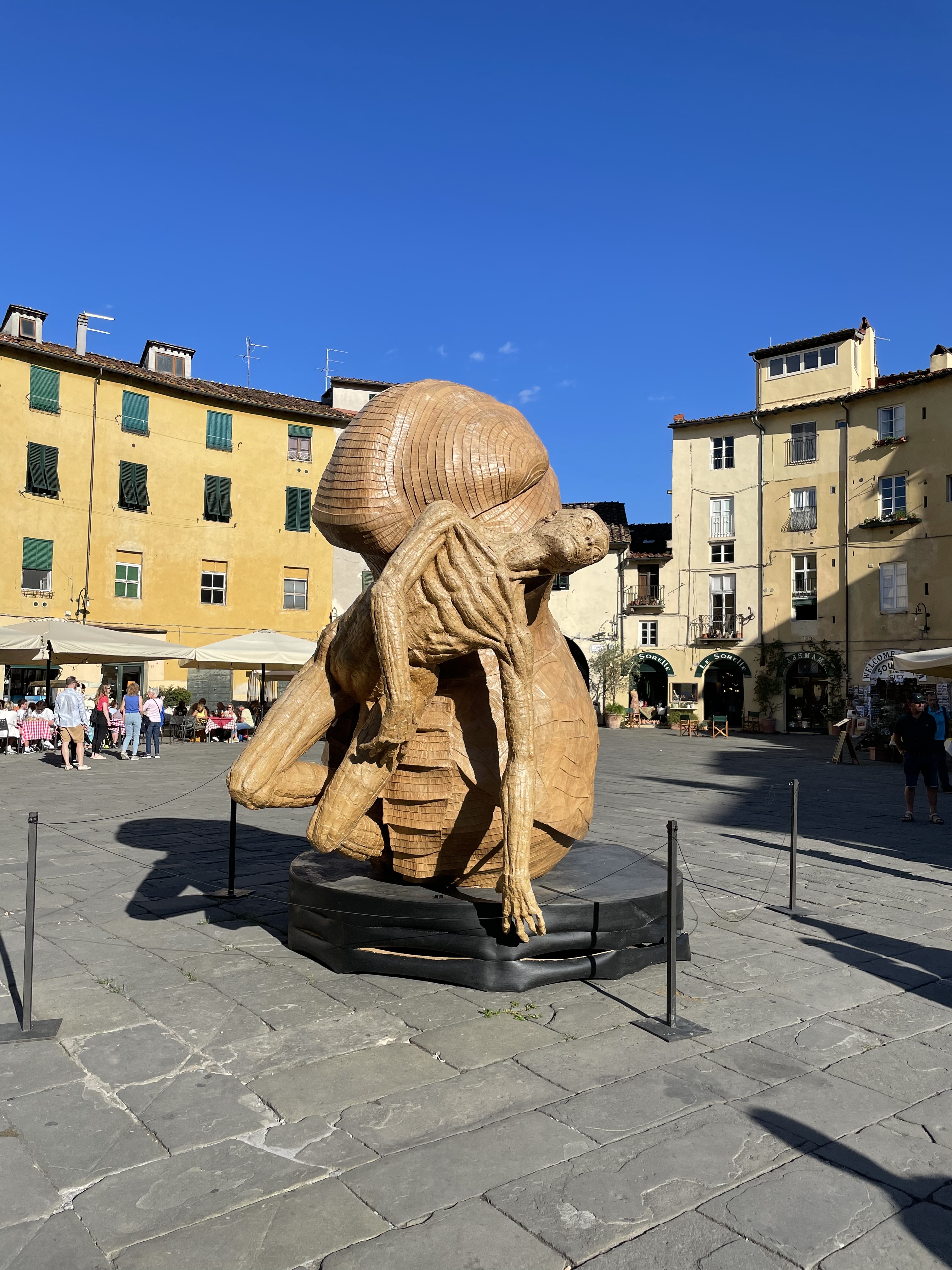 After the grandeur of Florence, Lucca wears its history lightly. It too has lovely buildings. It’s cathedral, the Basilica di san Frediano has a glorious 12th century mosaic adorning its front wall. Imagine 12th Century? That is at the same time that the Normans were knocking lumps out of the Saxons and building ugly foreboding castles. San Frediano by the way was 6th C Irish monk who became the Bishop of Lucca. Puccini the composer (as opposed to Puccini the plumber) was born in the town and, judging by his statue, seems to have been an arrogant so-and-so. A couple of popes also spent their first years here too. We had arrived during the biennale festival and everywhere we went, there were large cardboard papier-mâché sculptures that had been specially commissioned for the town. The last one we found was on the site of the roman amphitheatre which is now a charming piazza ringed with restaurants and featuring live music.
