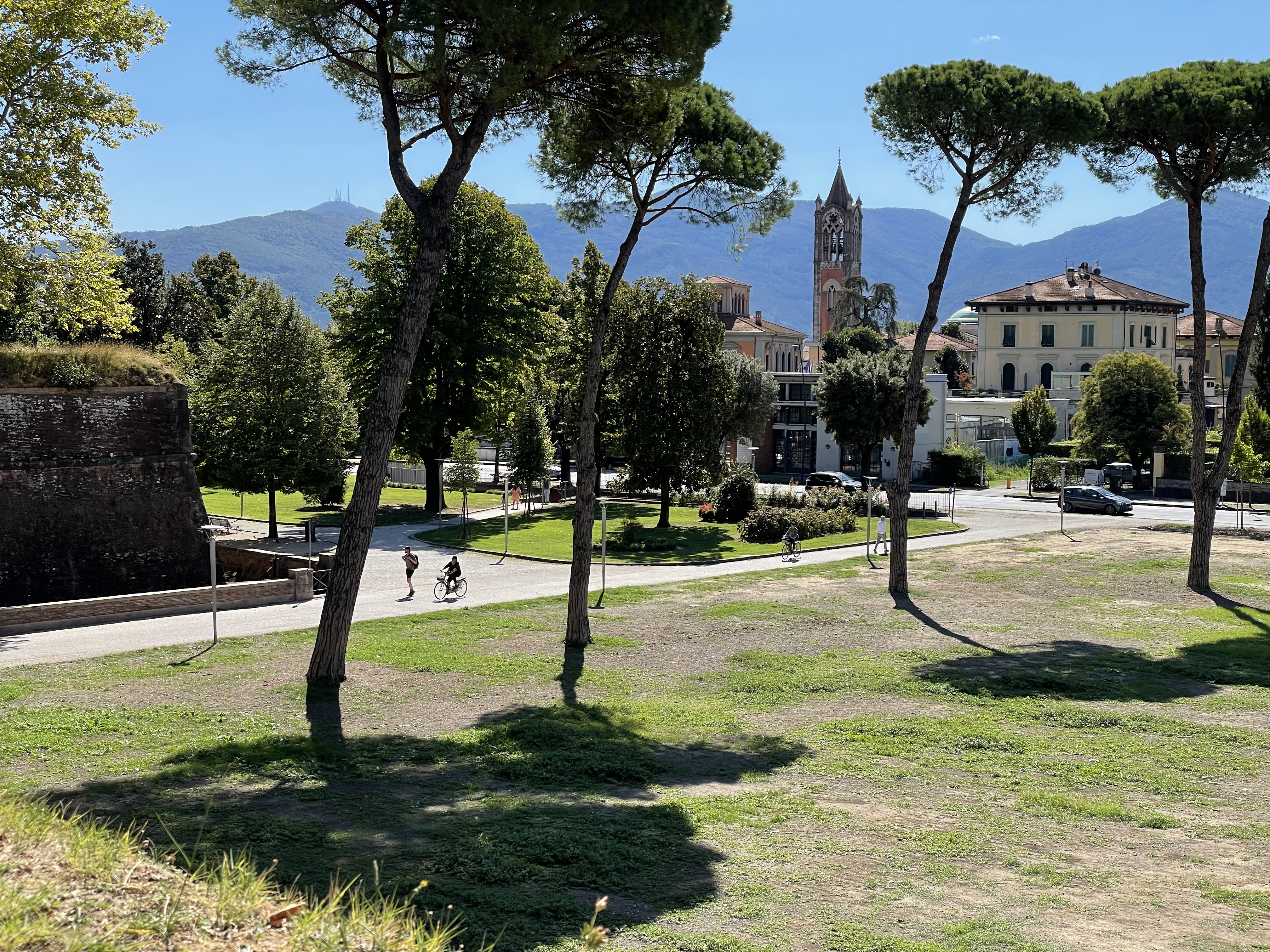 Lucca’s residents, well the ‘important’ ones that is, decreed in the 17th century that the old town walls should be replaced with new ones, and that now they were in the age of heavy artillery they needed to be big and thick. And indeed they are. At the same time the leaders of the town demolished several hamlets and a couple of churches that lay outside the town to give them a clear field of fire, with the result that the walled town is now set in a green park. Though the ramparts were built for defence they were very wide and the well-to-do realised that they were an ideal pace to promenade of an evening, and so to improve the atmosphere they chose to ban the hoi polloi from sharing it. Today’s Lucchese are very proud that their forebears weren’t going to stand for that and tore down the barricades and smashed up the signs and have been walking the walls ever since.