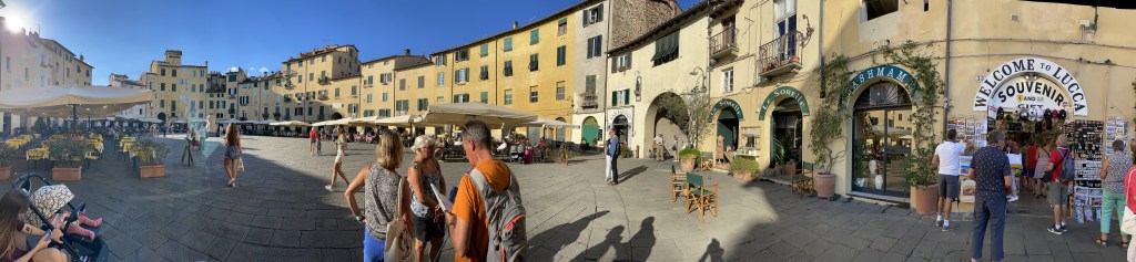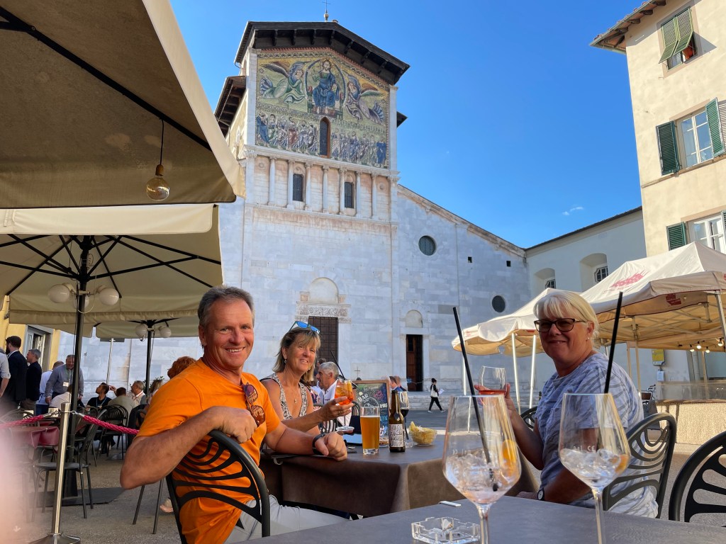 At our 40th anniversary party, Pino, an old friend of Paul and Hazel’s and Italian, strongly urged us to visit Lucca ‘as it was lovely’ – and indeed it is! However it has the grottiest campsite we have seen this year. Even worse than anything we have visited in the UK recently. Tiny pitches, no toilet paper, no soap, no changing space in the showers, some of the showers had no doors or curtains. All it has got in its favour and the only way it can survive is that it is only a quarter of an hour from the old town of Lovely Lucca.