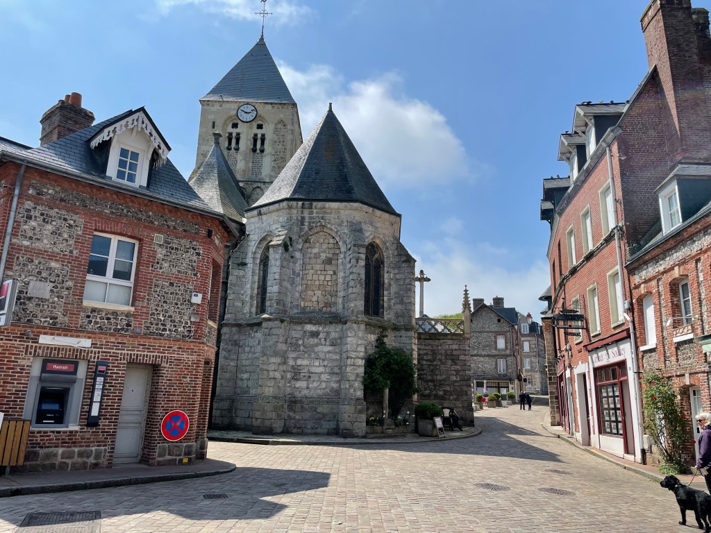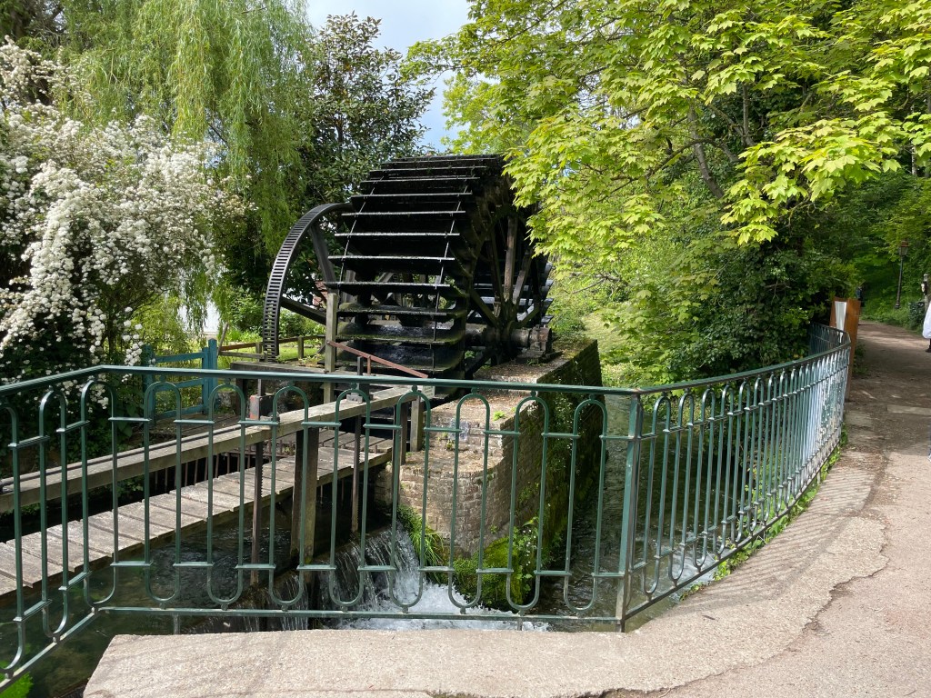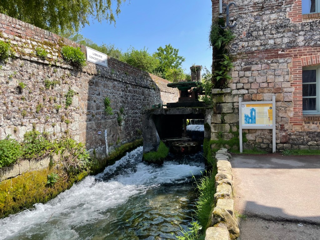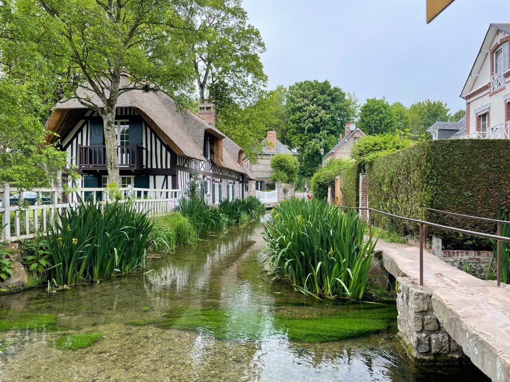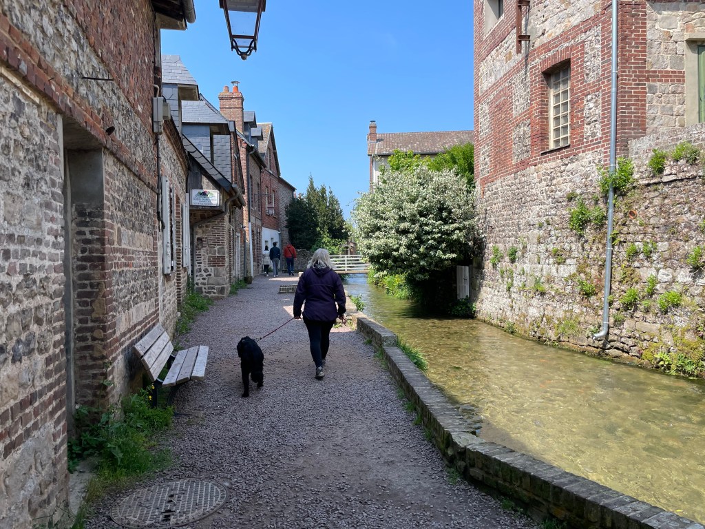 I guess few Brits have heard of Veules les Roses? It claims to be one of the oldest settlements in France with history going back to the 6th Century and it is built around the shortest river in France that flows directly into the sea. The river Veules is only 1.1km long, it rises at a spring, where the water bubbles up through the limestone, at one end of the village and pours into the sea at the other. We walked along it and found water cress ponds that saved Dieppe from scurvy, and three or four mills in various states of renovation that used to power the textiles industry in the Middle Ages and more half timbered houses than you can shake a stick at.