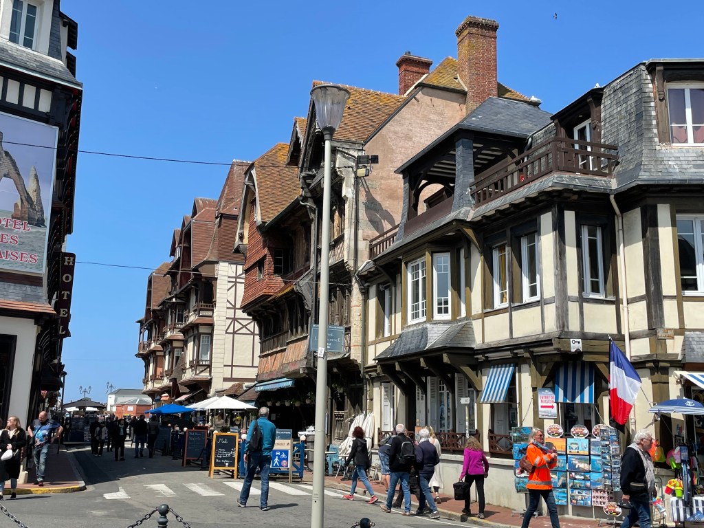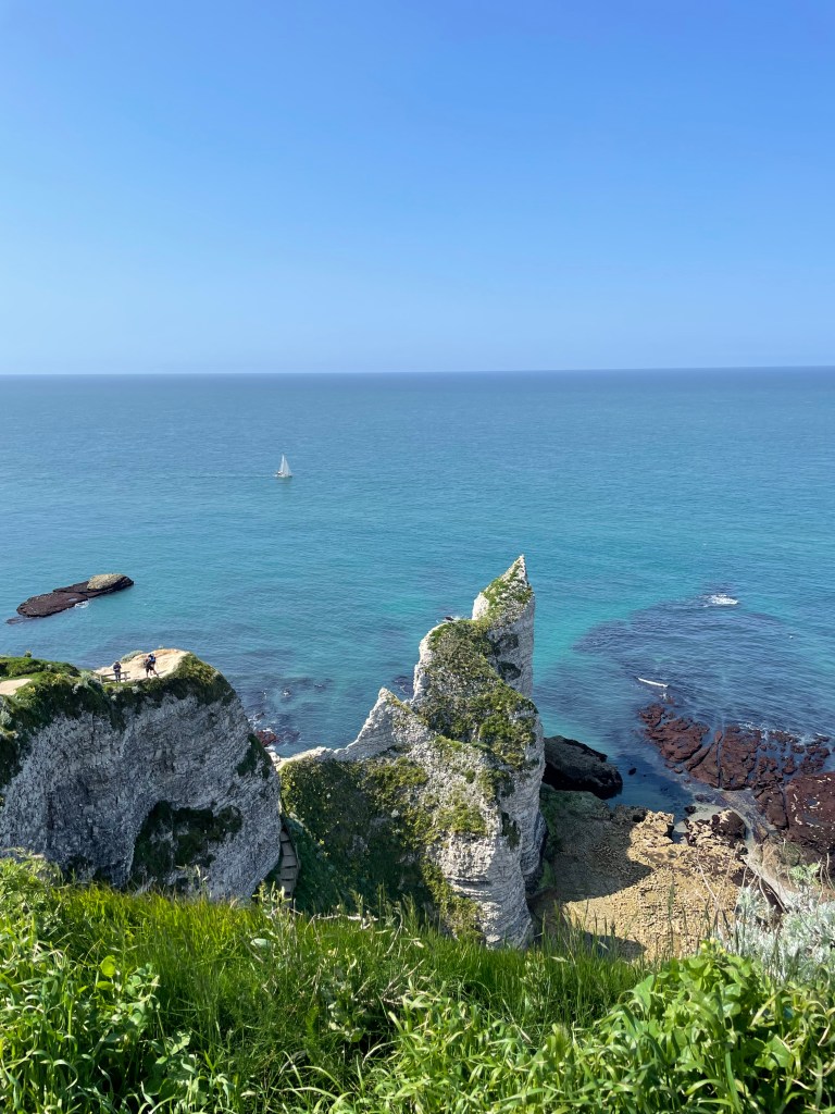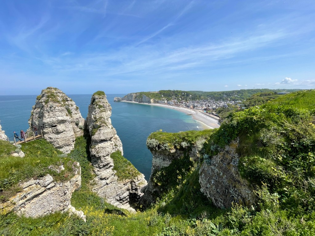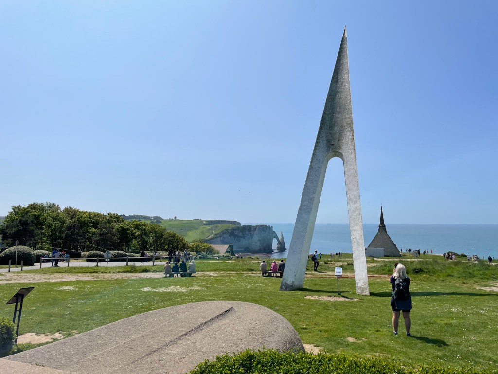 The rest of the village is idyllic, lots of half timbered buildings (many rebuilt after the depredations of WW2) a great choice of bars and it is framed by the iconic cliffs, the Falaise d’ Étretat. Both the east and west cliffs have been eroded by the sea into arches, stacks and pinnacles and the further you walk along the cliff tops the more you find. At the top of the east cliff there is also a marvellous 60s needle-like sculpture; a monument to Nungessor and Coli, two French First World War flying aces, who, in 1927, set out to be the first people to cross the Atlantic in an aeroplane. They left Paris on the 8th May, were seen crossing the cliffs of Étretat and again over Ireland, but never seen again.