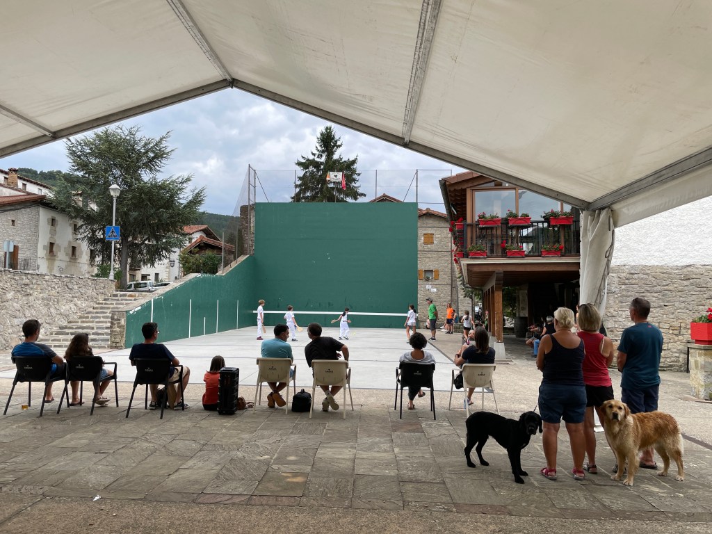 Pelota is the national sport of the Basques (the ancient Basque region straddles the Spanish/French border in the western Pyrenees and the folk see themselves as distinct and apart from both countries). Pelota is played on an oversized squash court and has many different varieties. In some the ball is hit with the hand, in others with a bat and in others with a type of basket that is strapped to the forearm. Today there was a children’s doubles competition taking place with plenty of proud parents politely applauding. As proud parents ourselves we thought it only right to have a beer in support.