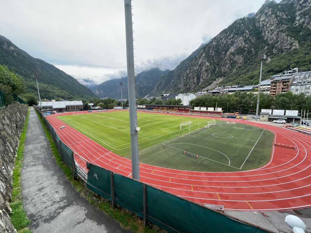 Andorra is a place where flat land is at a premium. It really is just one very steep sided valley surrounded by incredibly high mountains. (Little did we know but these were going to be a navigational hazard tomorrow.) Almost all the buildings are four or more stories high. Our campsite was steeply terraced and we overlooked the community sports ground that consisted of an astroturf soccer pitch surrounded by a six lane running track. A little further away was Andorra’s national football stadium that didn’t look much bigger.
