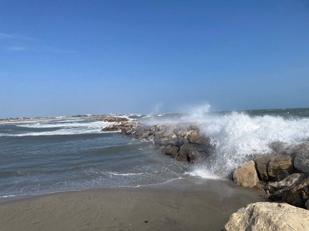 From here we moved on to Saintes Marie de la Mer that styles itself the capital of the Carmargue. Our campsite for the next couple of days, Camping le Clos du Rhône, is right on the beach and the breeze was no longer fresh but a howling easterly around 40knots the sand was stinging our faces, arms and legs as we walked to the small beach and the sea was très agité, sending the waves crashing over the breakwaters protecting the beaches and the spray falling on us below.