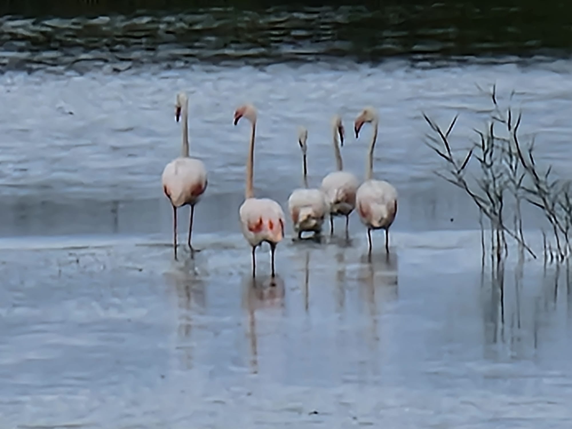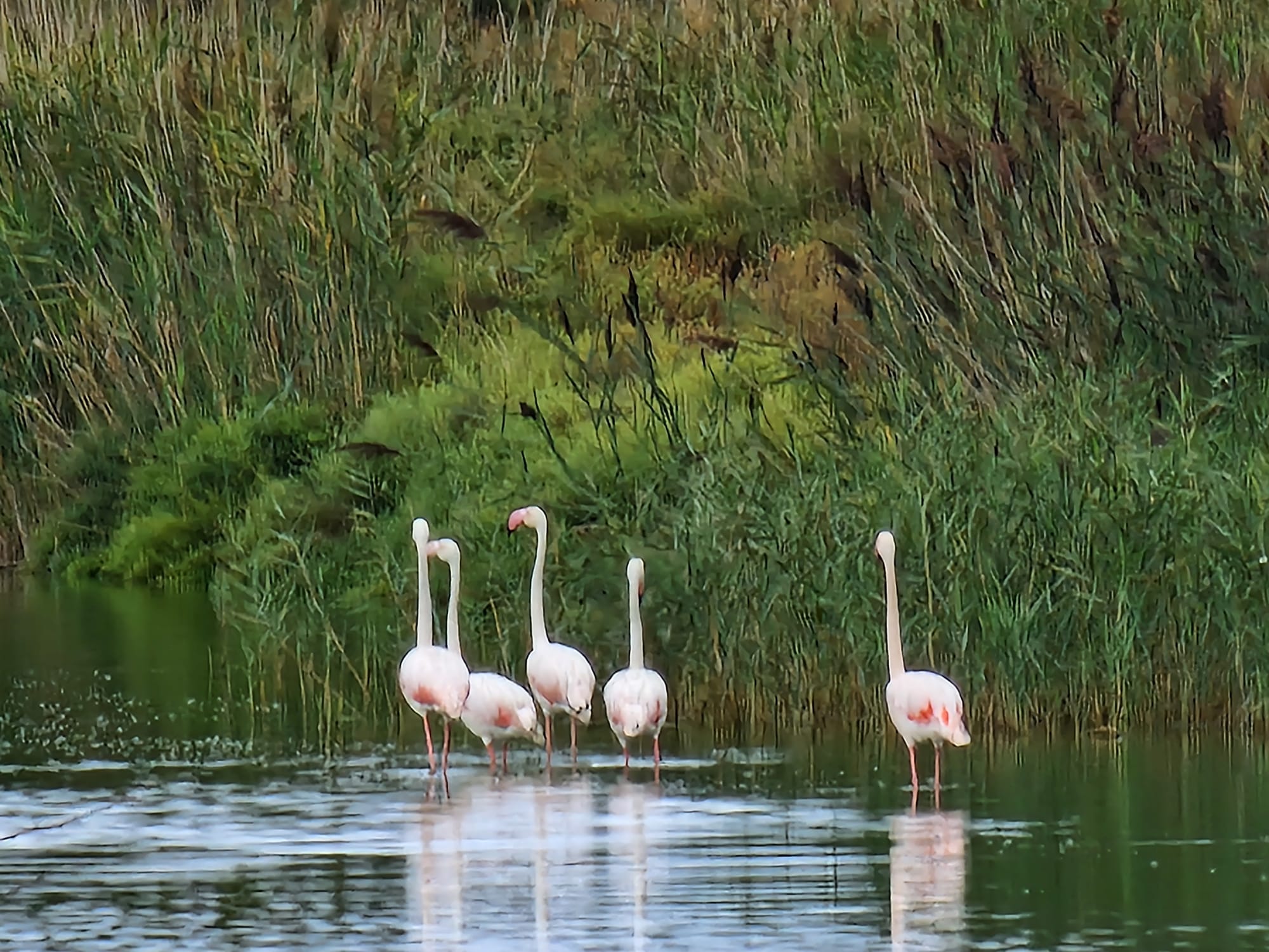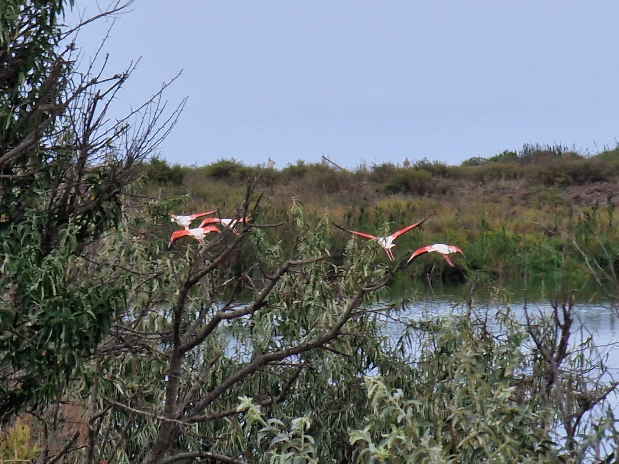 And that leaves the flamingos. We were right at the end of flamingo season and many of them would be soon flying off to Africa for the winter. We are not easily put off so we walked past the delights of Saintes Marie and on to a track that led across the marshes to some large lagoons, and I do mean large, as in miles across. Then we saw a faint, pink blur on the horizon and through Andy’s telephoto lens could just about make them out to be flamingos. That looked as if it was the best view we were were going to get until around a corner of marsh we saw five, shovelling through the silt for all their worth. It was a marvellous sight and then a couple of people ahead of us spooked them and we were treated to a vibrant pink fly past as they sought a more secluded spot away from prying eyes.