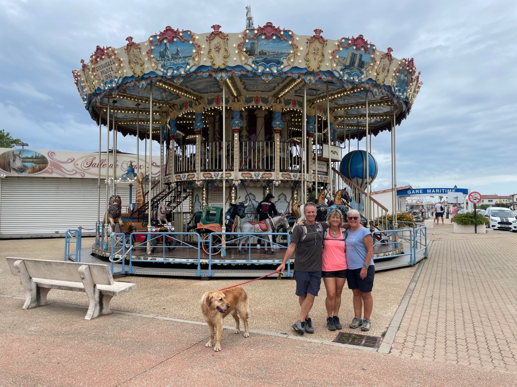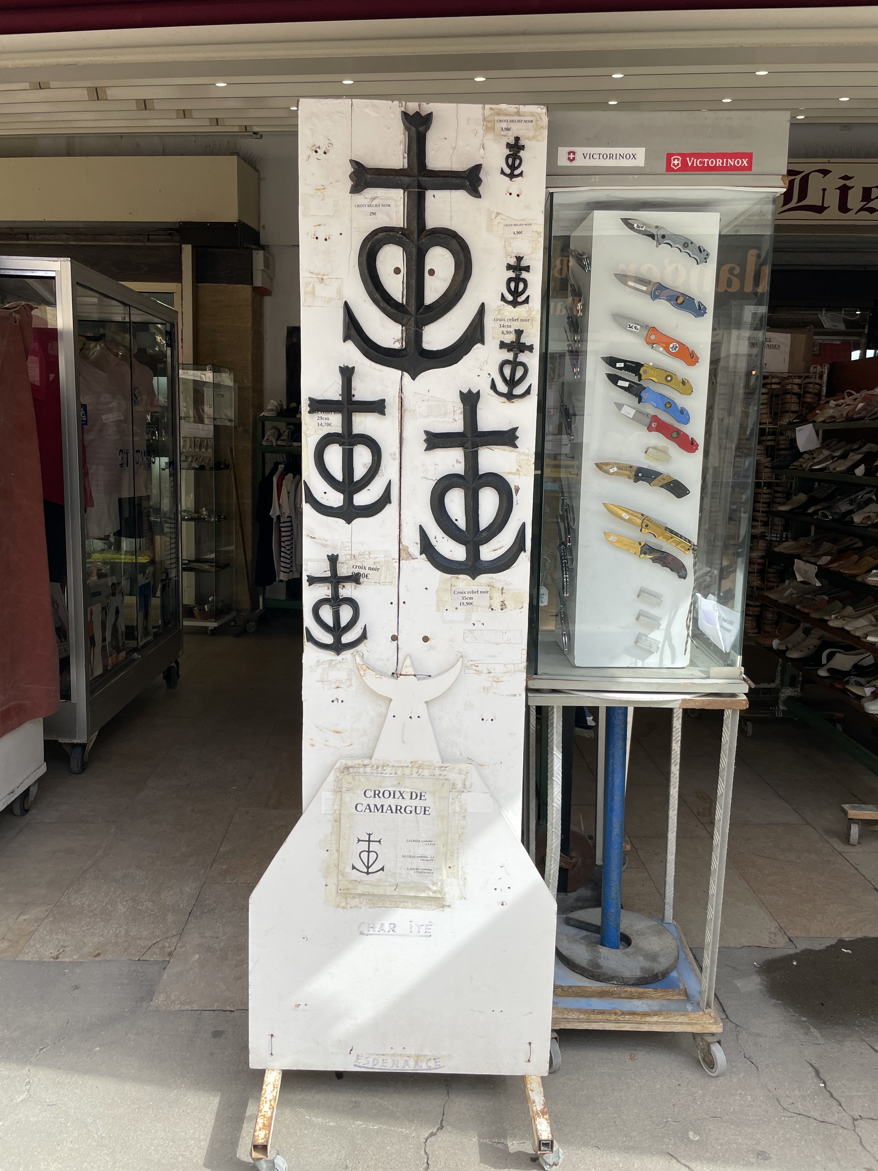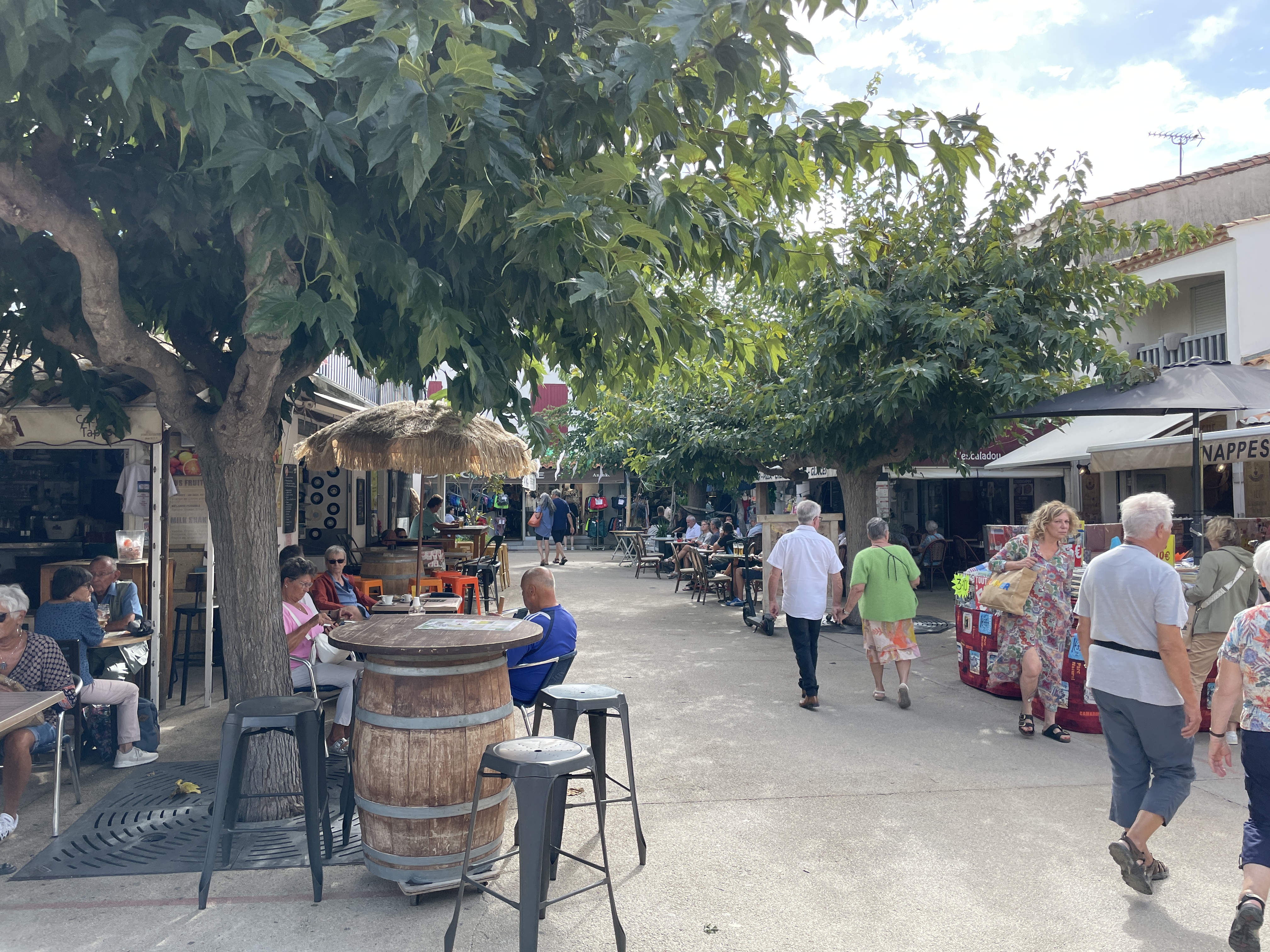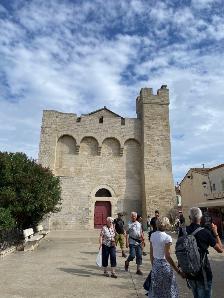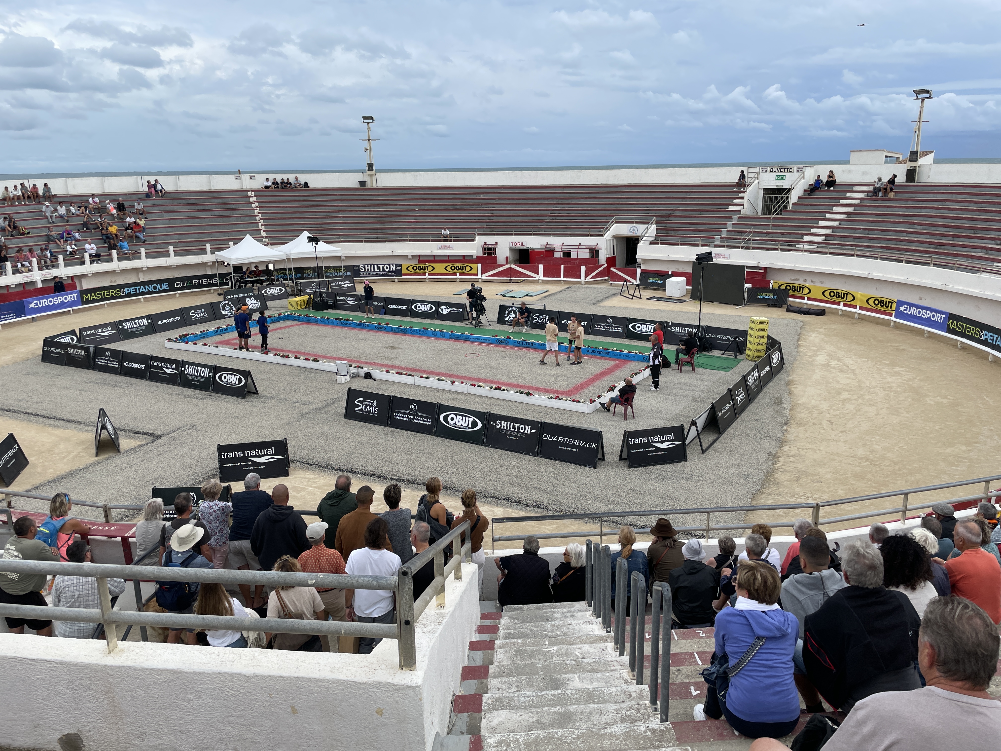 On our way back we walked through the town to have a beer in the shadow of the church and Wendy and Lesley wanted to explore the high end tourist tat shops. There were threats made of buying fluffy flamingos to hang from the rear-view mirror, which fortunately came to nothing. It is a very attractive place and has been for years. Van Gogh painted a number of pictures here in 1888. As we passed the bullring on the sea front the doors were open and a pétanque competition was taking place. It was free so we walked in and saw a junior match taking place that was being televised for Eurosport. The two teams of three lads, who looked to be about sixteen, were playing to an exceptionally high standard and we were swept up in the emotion of the match, applauding with everyone else the masterful shots. A much better use for a bullring.