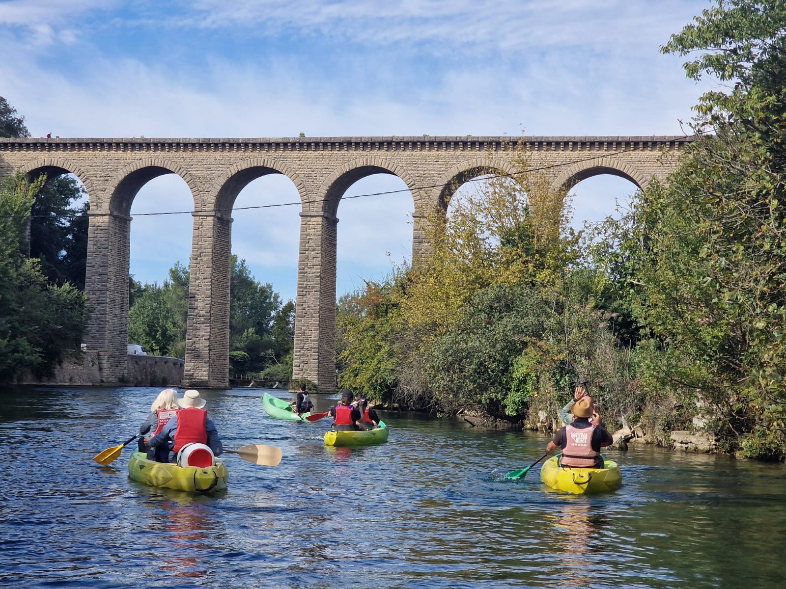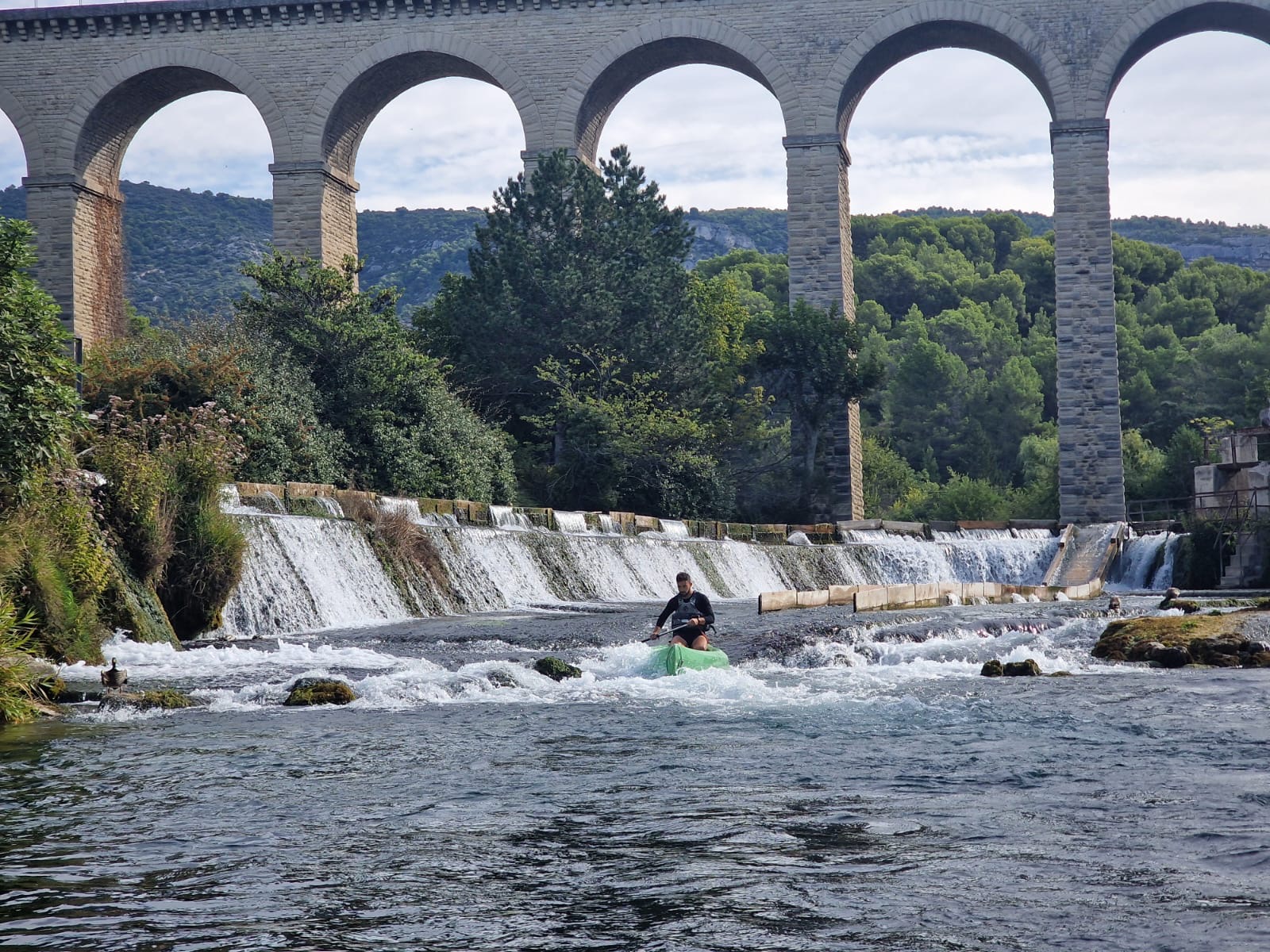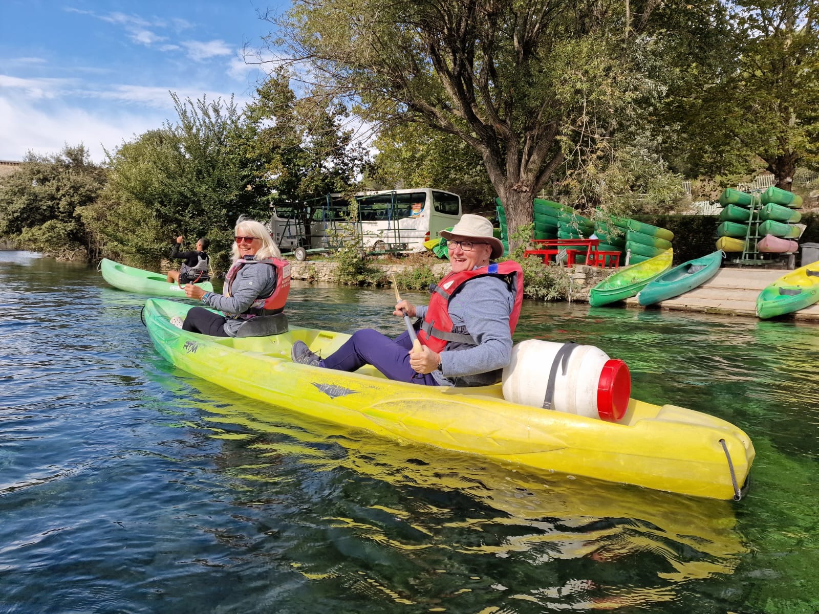 Just after setting out we passed under an elegant aqueduct, built in the 19th century to carry a canal across the river, then we came to the first weir. We were surprised by our guide (The Sorgue is the only privately managed river in France and as part of the management of the river, every canoe trip has to have an approved guide with them to ensure we all behave appropriately.) jumping out of his canoe and opening up a small gate to one side of the weir. He then beckoned us through. The gate led to a wooden chute that sent us hurtling down into the water below, flooding the canoes as had happened to us on the l’ Orne. Bryn would have been swept out again. Enzo sitting in the middle was fine as Lesley bravely shielded him. We had a couple of Americans in our group and the woman in the front of their canoe was washed out, with a heck of a scream as she met the 13° C water. She moaned and shivered (inappropriately dressed!) her way to the next weir, which was even steeper and again she got wet and boy did we know about it. Our guide took pity on her and instead of shooting the final weir we took a side stream of rapids around it.