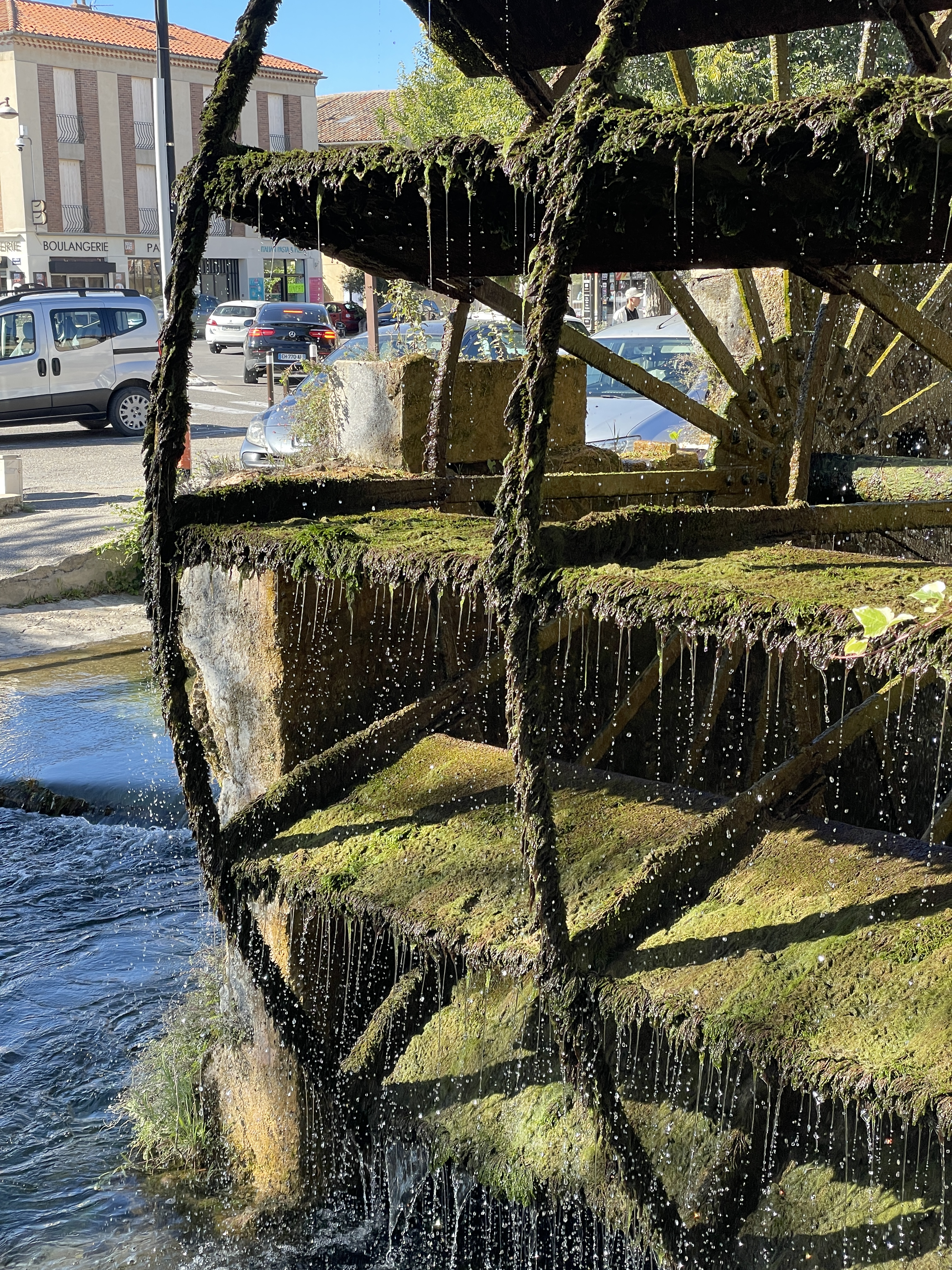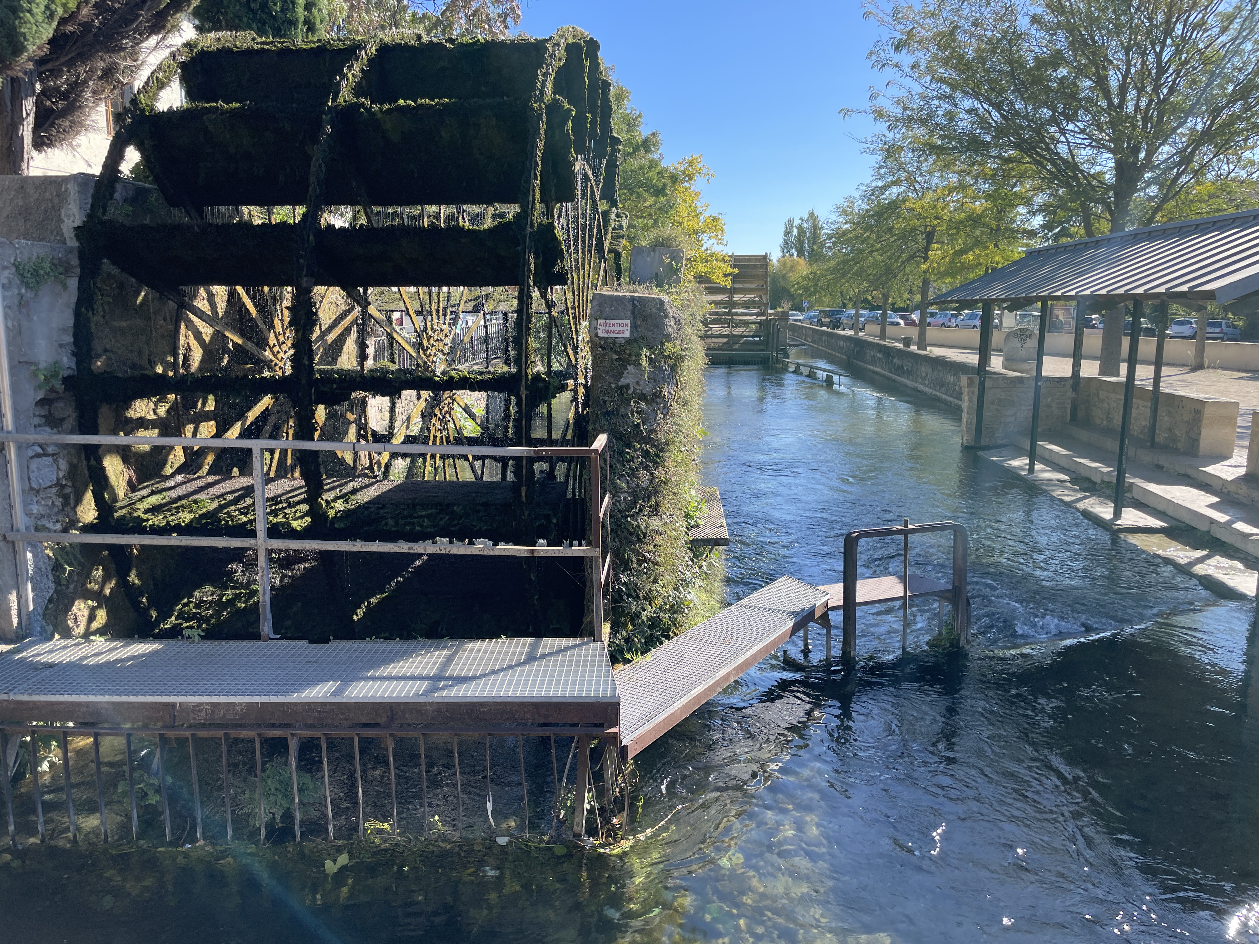 Once the Sorgue was heavily industrialised. The water wheels in the town bear witness to that, powering woollen and silk mills, established by royal decree in the early 1800s. Our route this morning involved crossing three weirs created to power mills above l’Isle.