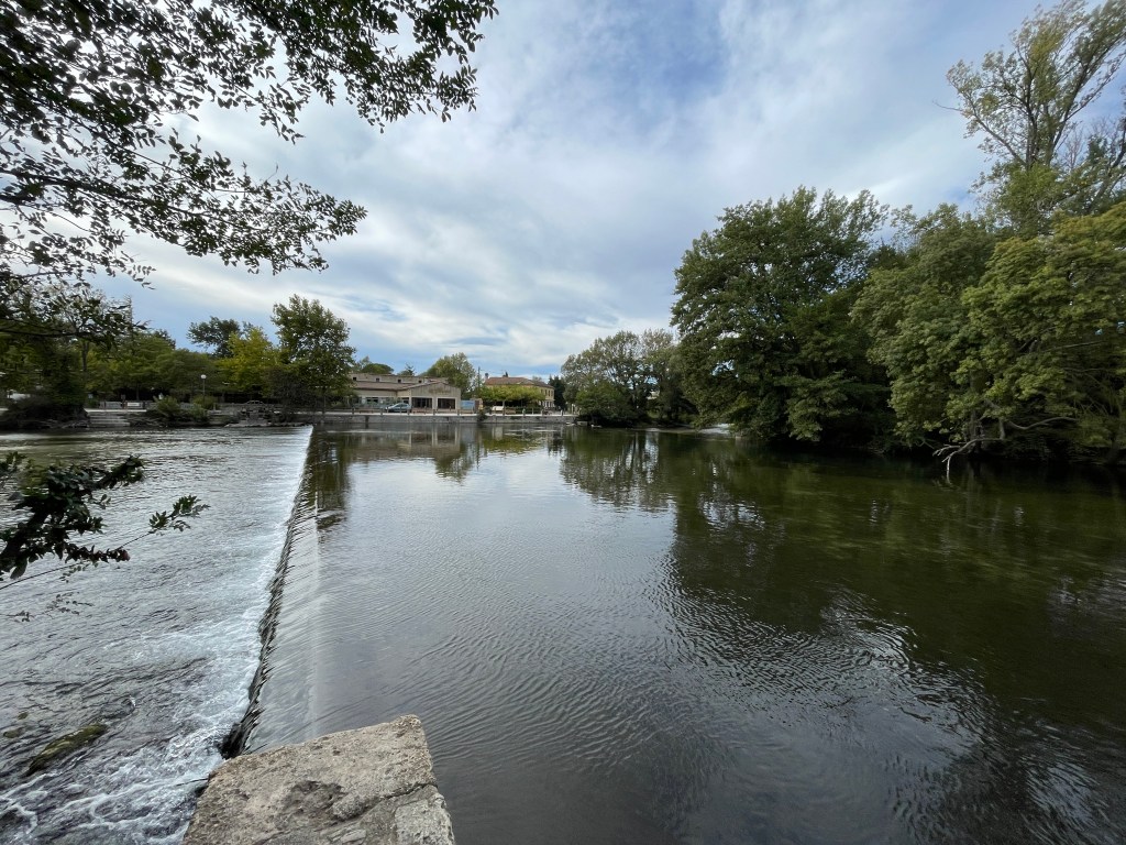 Before we knew it we arrived at the “Partage des Eaux” or the “Parting of the Waters”. As the name suggests here the river divides again, but this time it is no accident. A parallel weir splits the Sorgue in two following a decree by Napoléon III on the 27th March 1852. It even specified that 5/12 of the water should flow one way and 7/12 the other. It is a fascinating sight and engineering feat, that now looks almost natural.