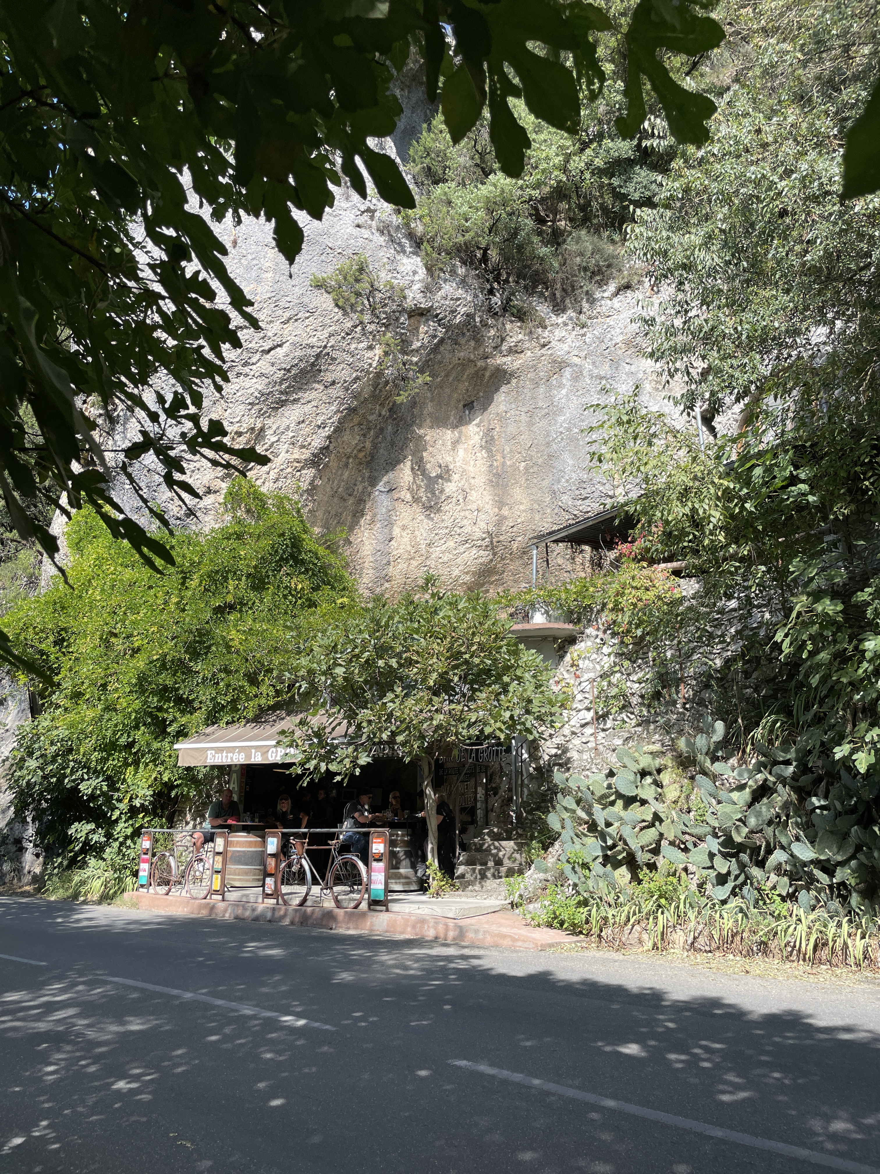 Wendy and I planned to catch the free bus back to the campsite, but when we got to the stop, discovered that the next bus was on Saturday, so we walked back along the road, past a couple of campsites already closed until next year, through a tunnel and discovered a bar in a cave right by the side of the road.