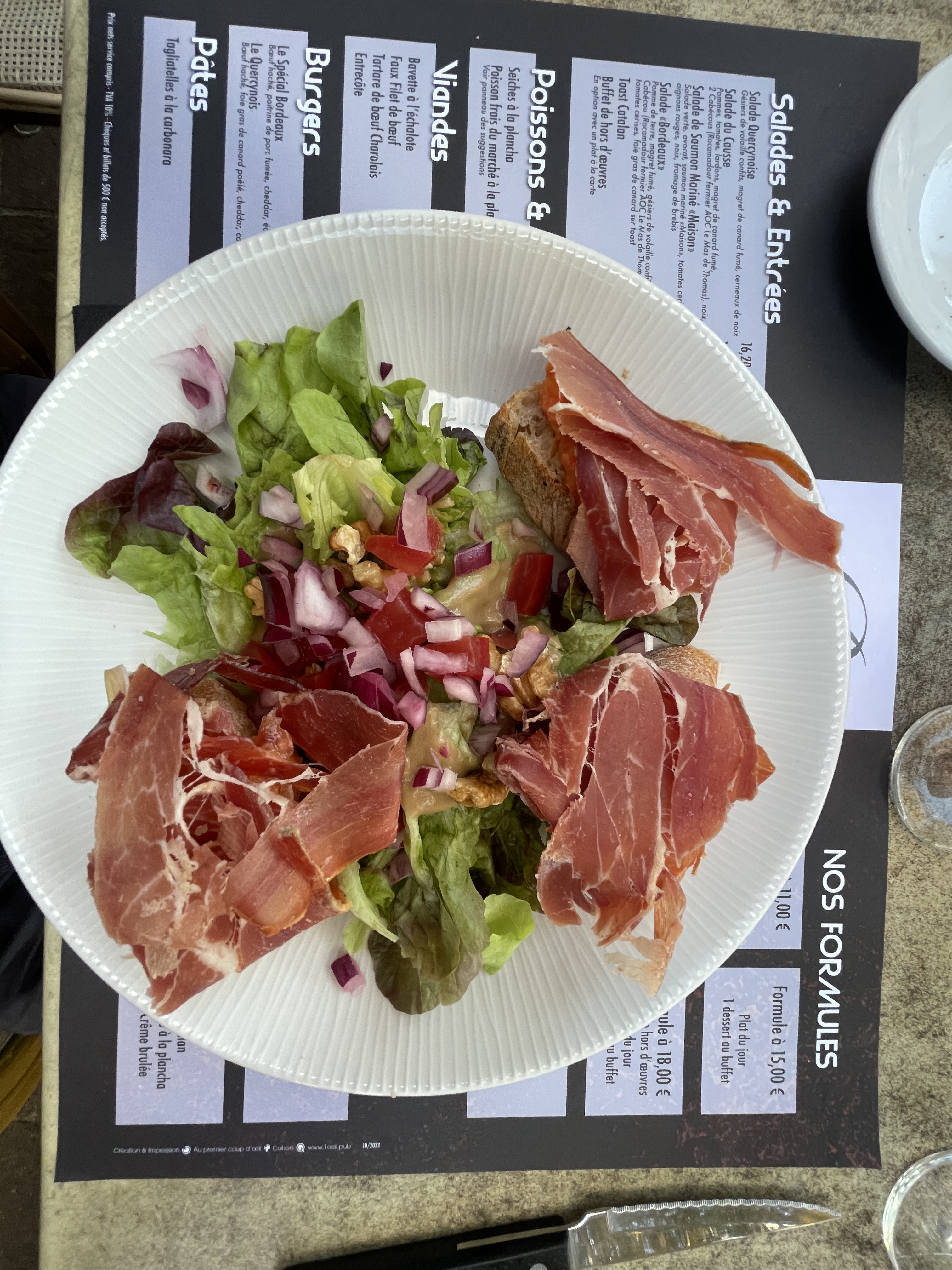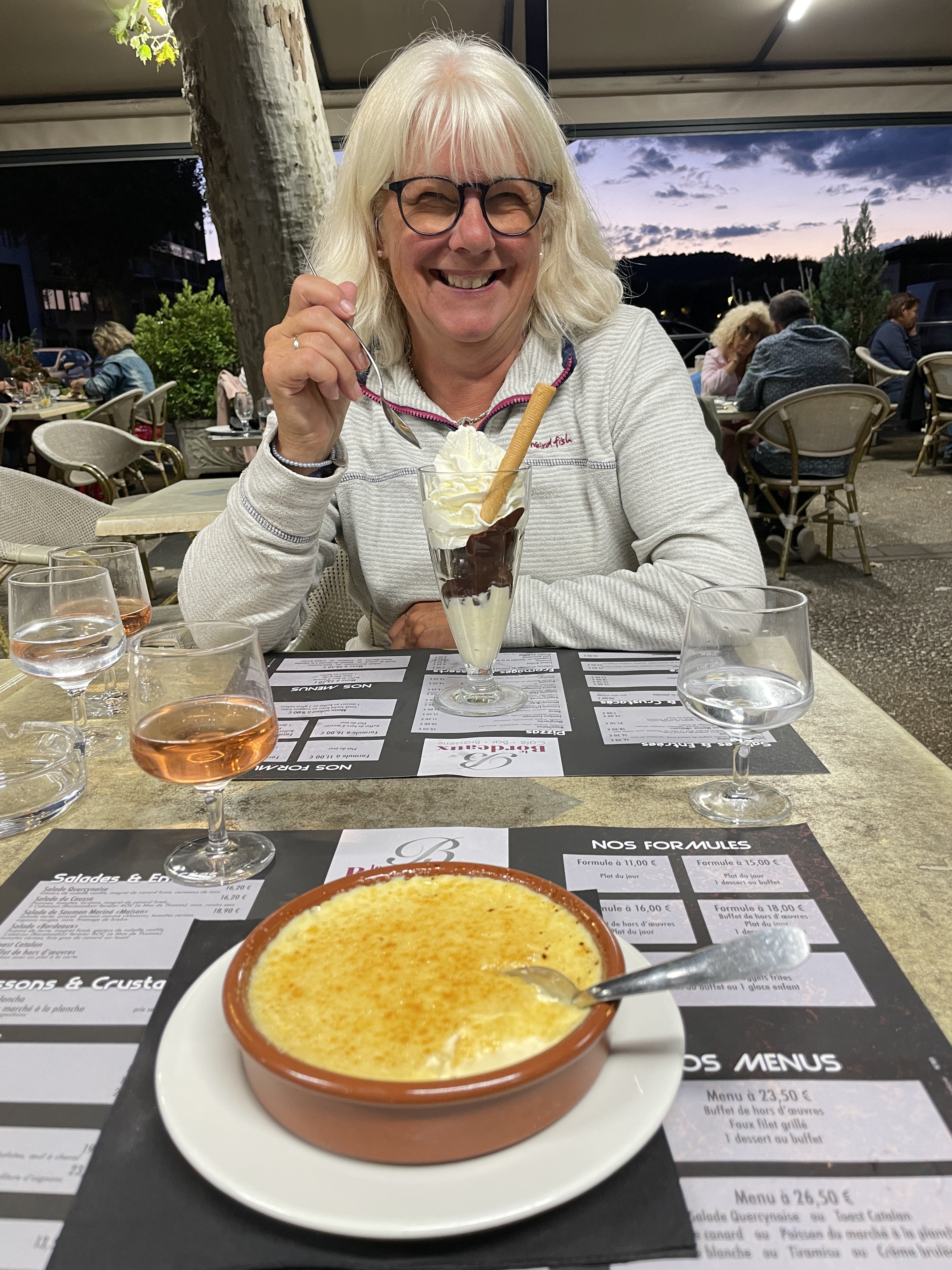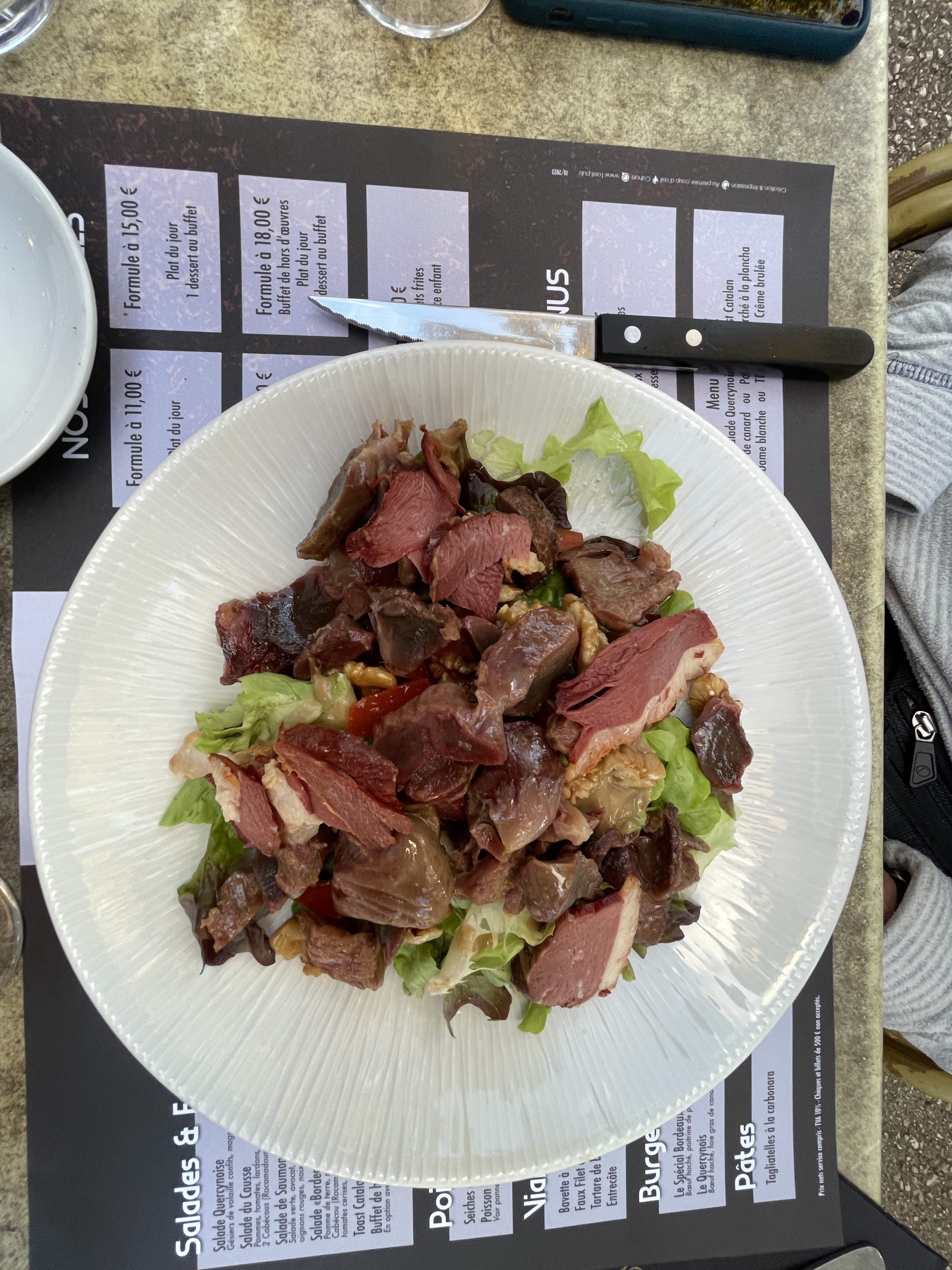 We didn’t really have the time to properly explore Cahors. Wendy was hungry by now and had no enthusiasm for a bit of culture, so we were looking for a good restaurant. After turning her nose up at burger and pizza places she found a good one though. We had the meal of the day which for Wendy meant Salade Quercyoise and Salman while I had the Toast Catalan and Canard – delicious! It made up for missing out on seeing the oldest fortified bridge in Europe. I apologise for the quality of the photos, but the sun was in the wrong place and where is Foz when you need him (probably climbing a volcano?)